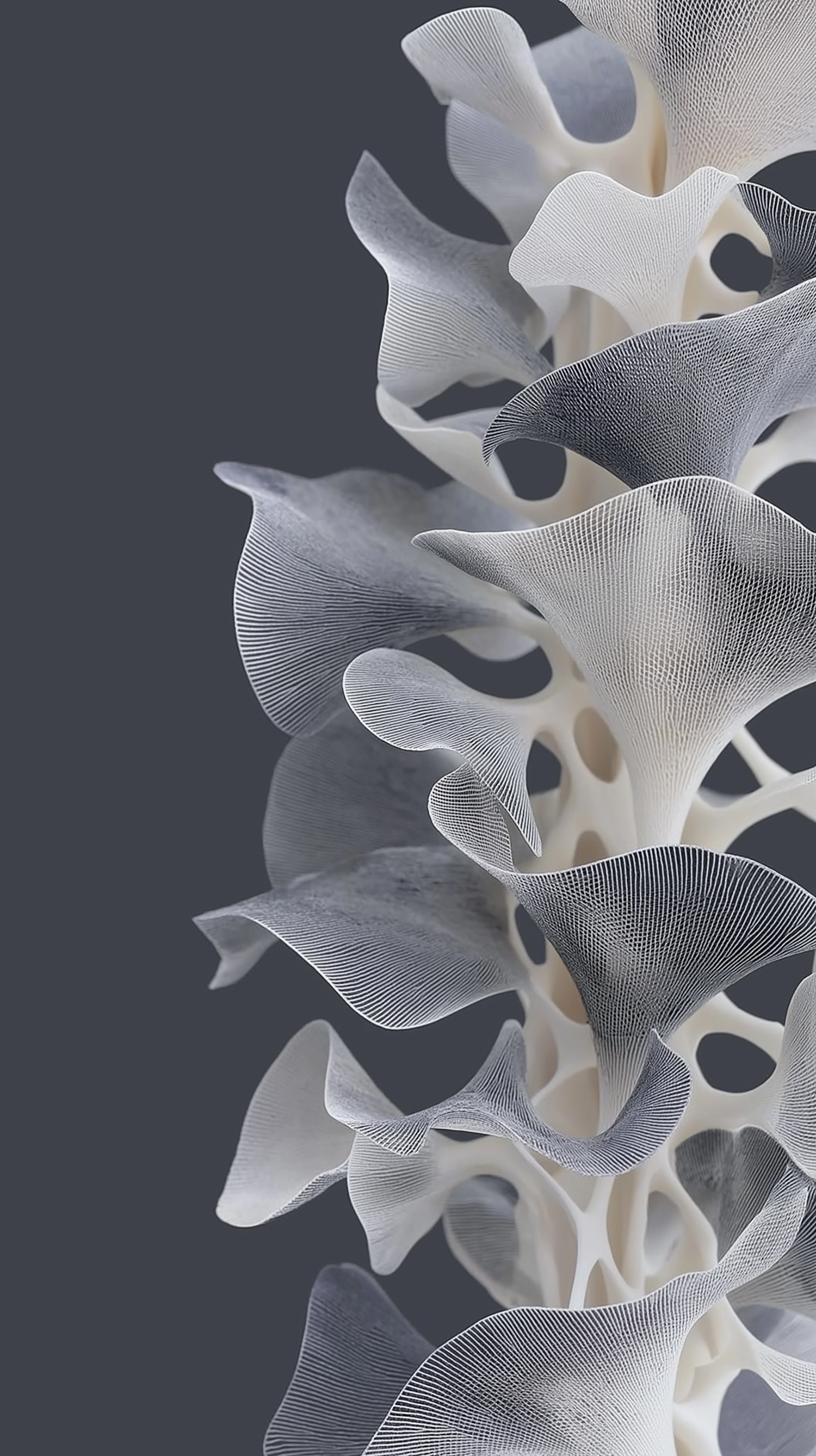 A stunning abstract 3D artwork with layered, translucent shapes on a dark background.