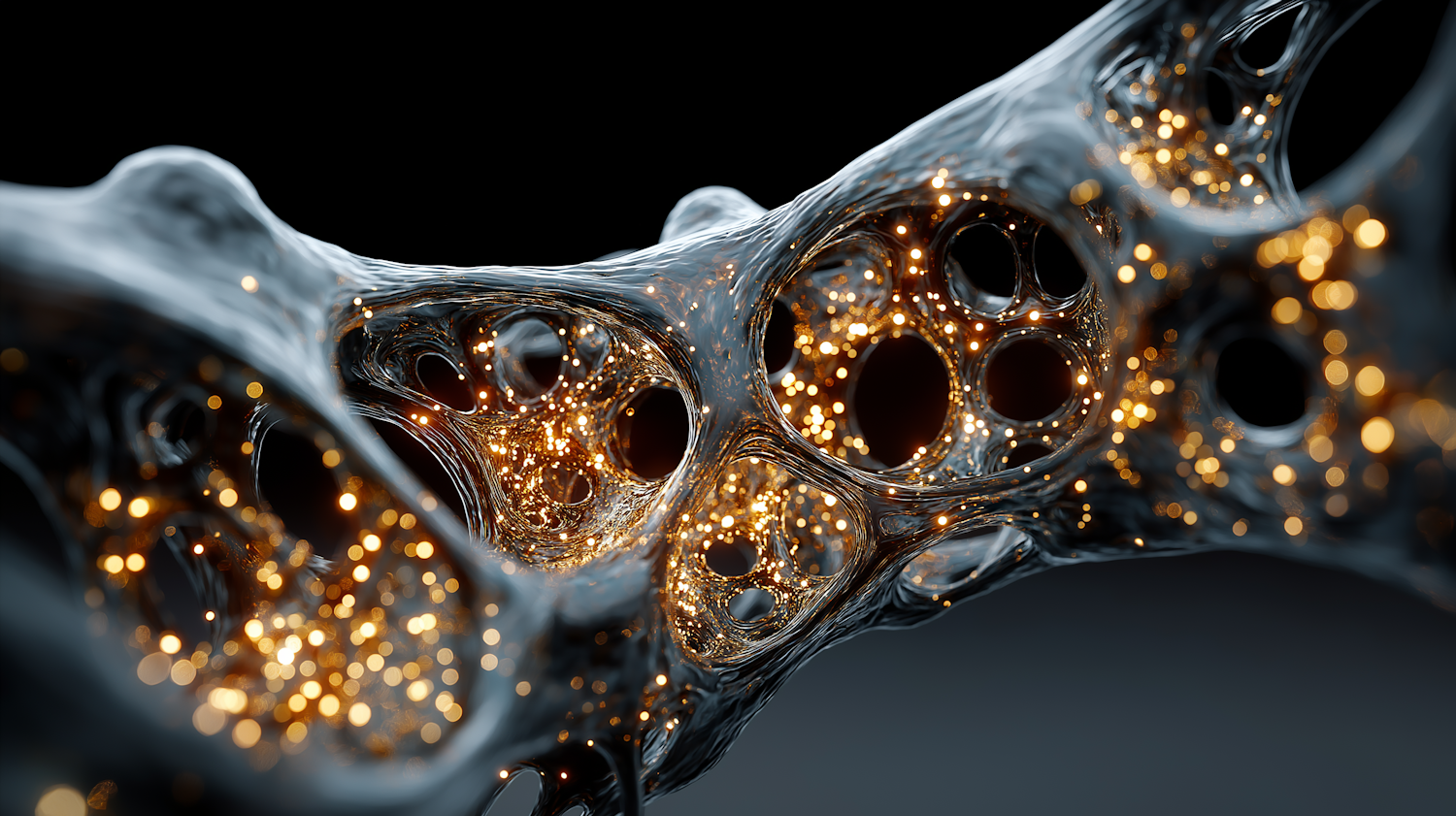 Abstract 3D art of a glowing, web-like structure with golden lights against a dark background, creating a futuristic and ethereal vibe.