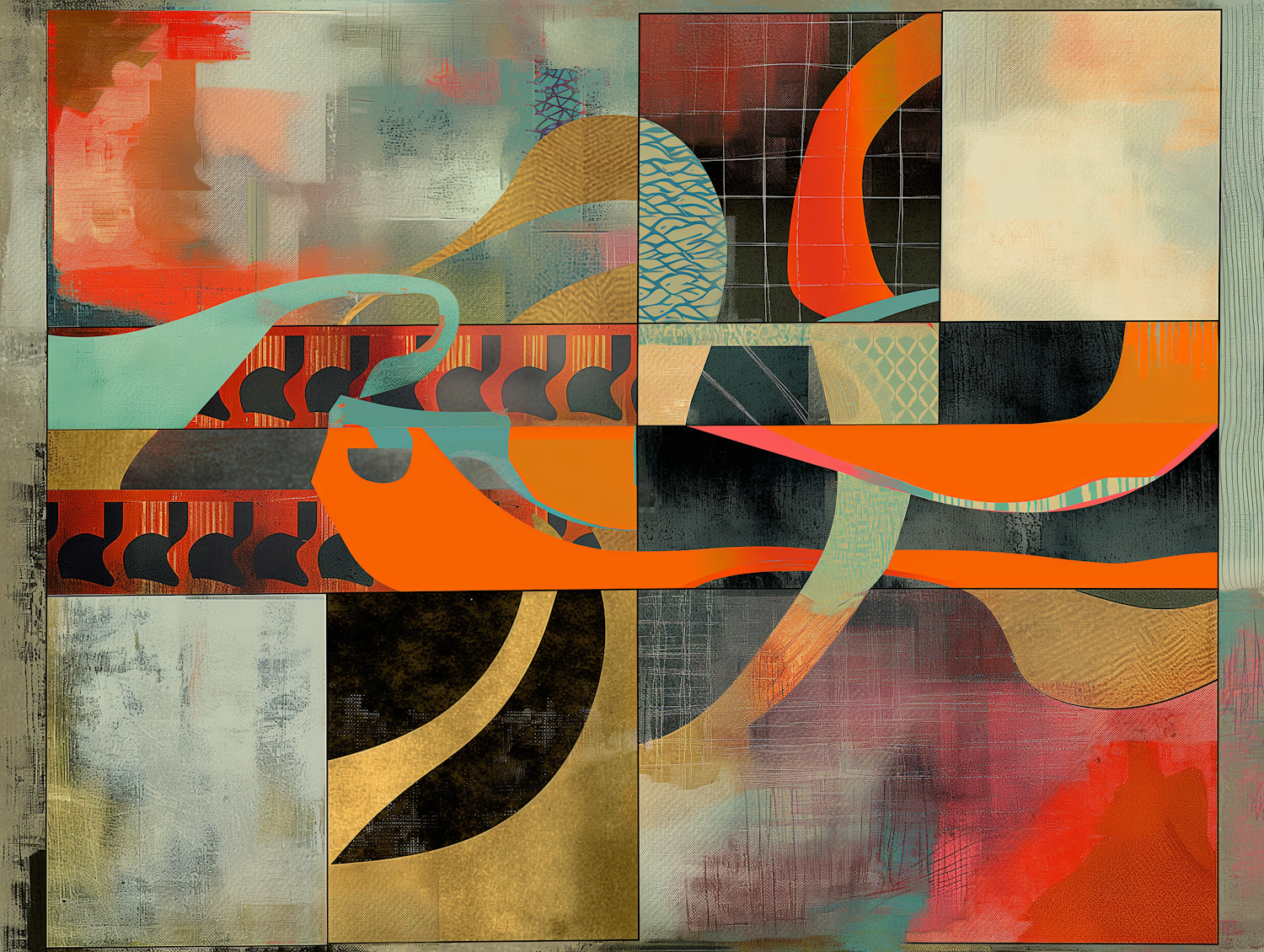Vibrant abstract art with bold orange, teal, and gold shapes on a textured background. Dynamic geometric patterns create movement.