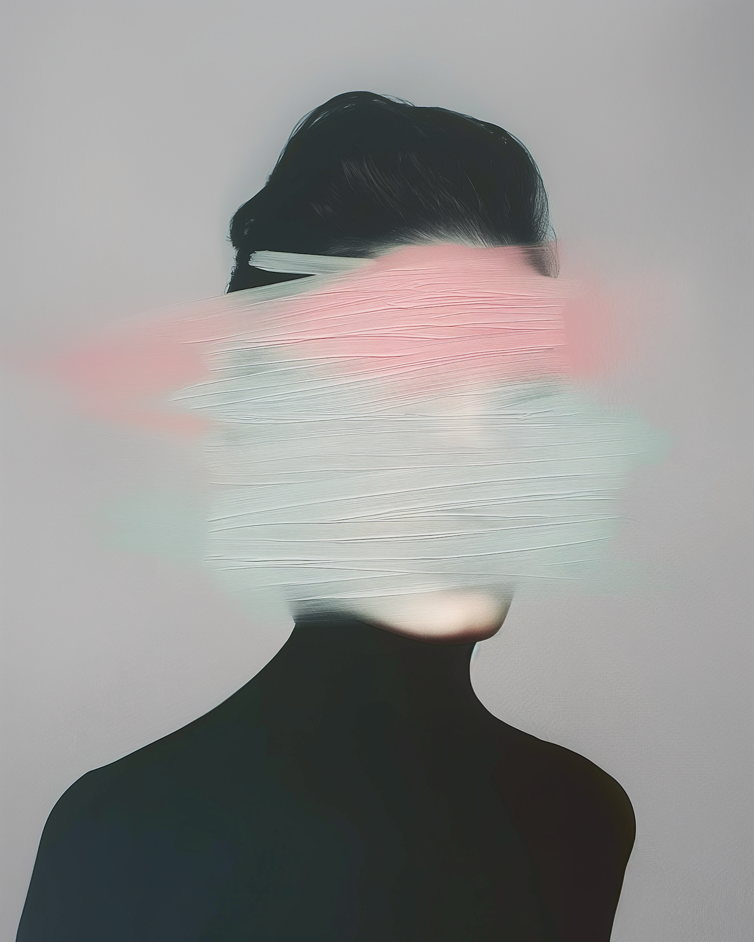Surreal portrait with face obscured by pastel brushstrokes, blending human form and abstract art in a dreamlike composition.