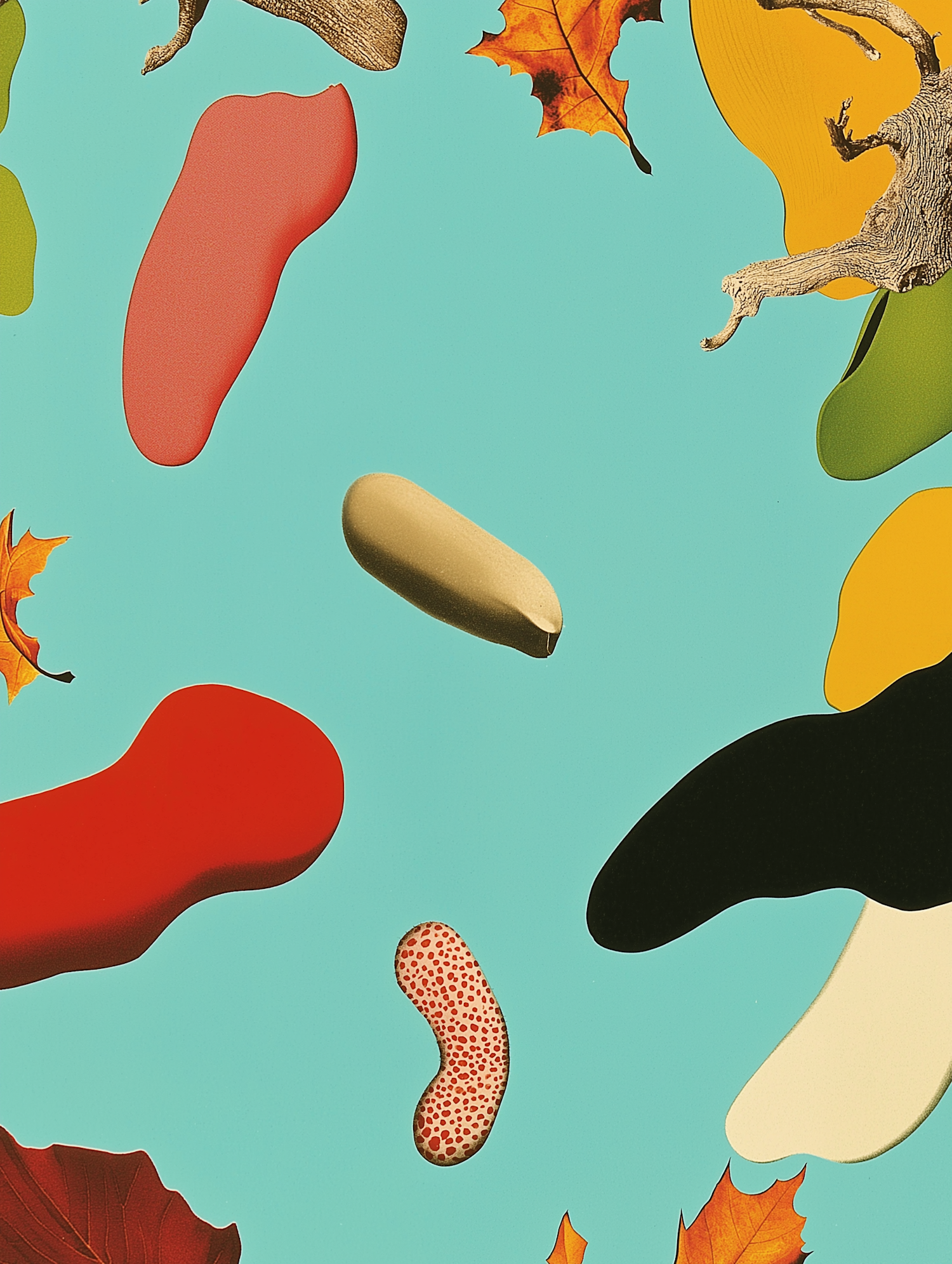 Abstract art with colorful shapes and autumn leaves on a turquoise background, creating a playful and dynamic visual scene.