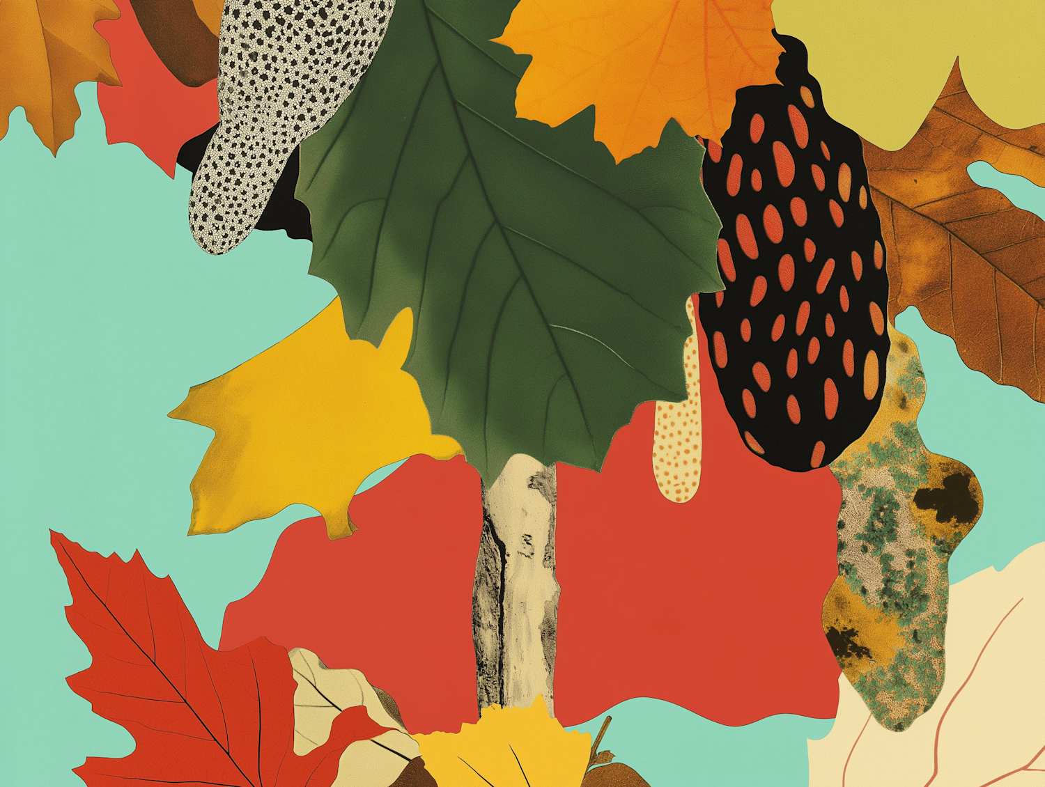 Abstract illustration of colorful autumn leaves with patterns on a teal background, creating a vibrant and dynamic composition.