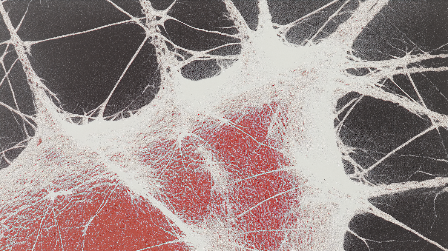 Abstract web-like filaments with red fibrous textures on a dark background, resembling a biological or microscopic structure.