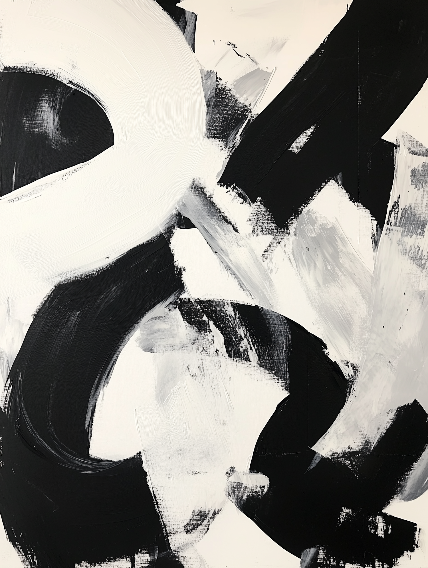 Dynamic abstract painting with bold black, white, and gray brushstrokes creating a striking modern composition.