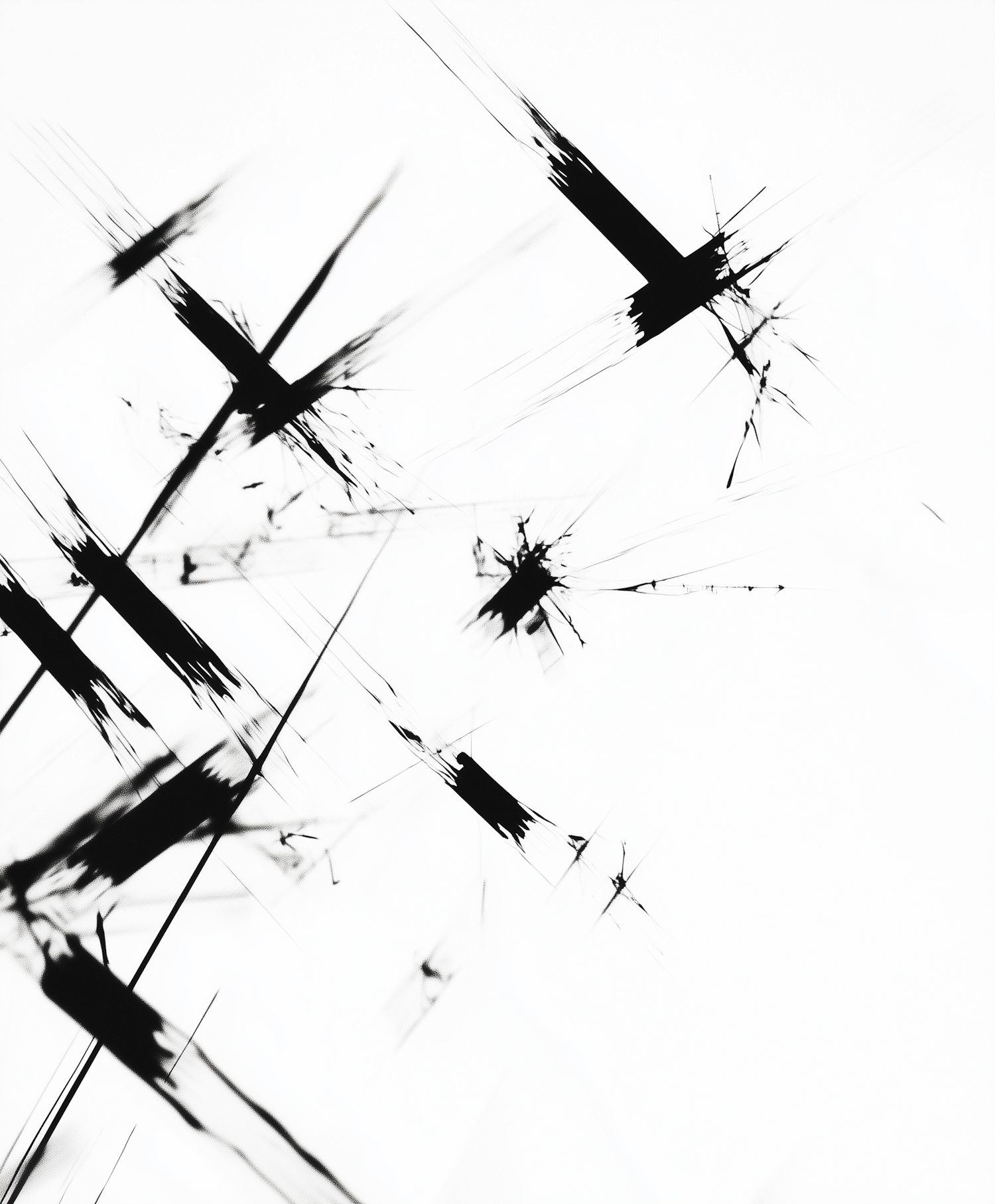 Dynamic abstract art with sharp black lines on a white background, creating a sense of motion and energy.
