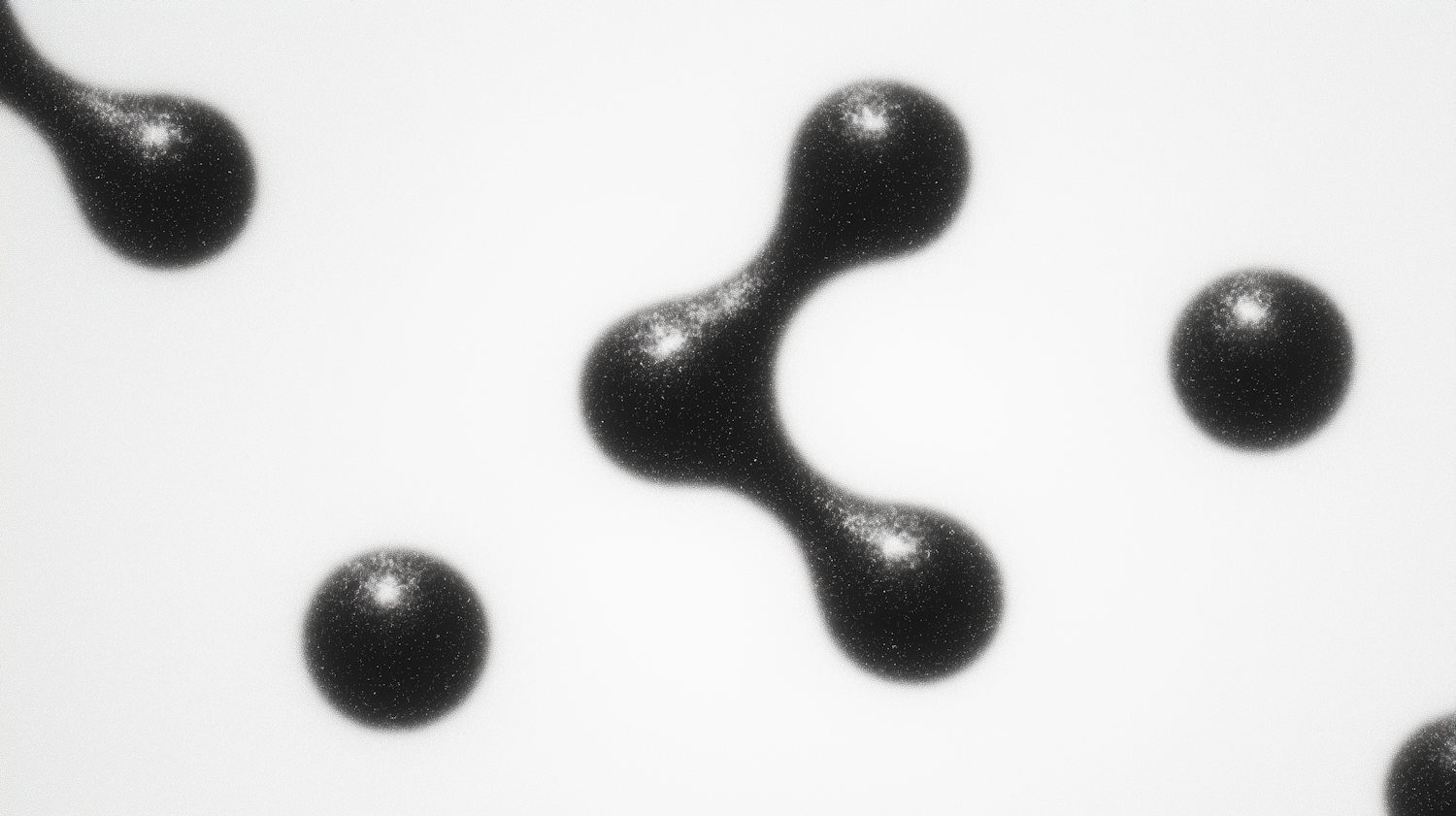 Abstract black shapes resembling molecules on a white background, featuring a glossy, speckled texture for a modern, minimalist look.