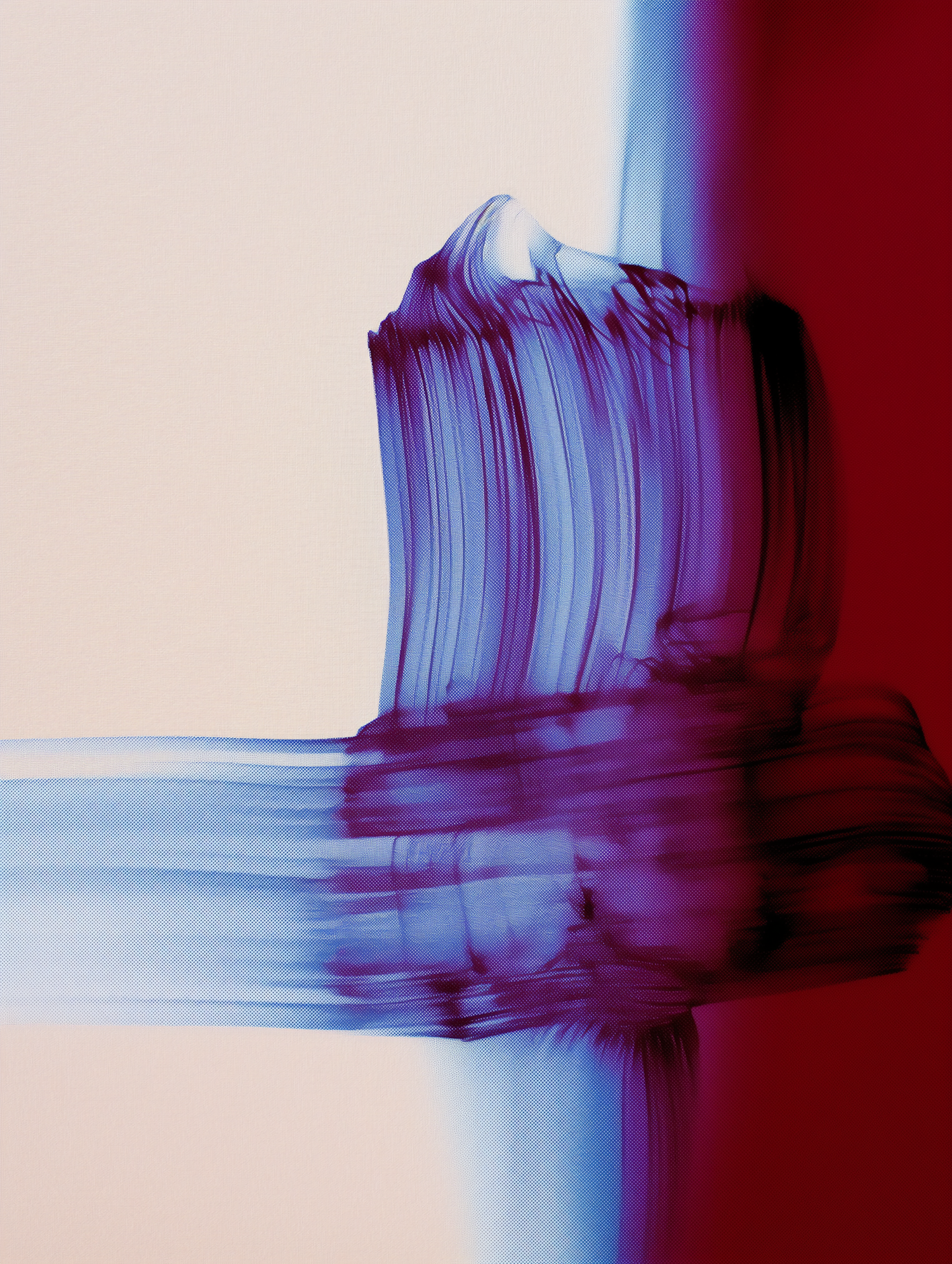 Abstract art with bold blue and purple brushstrokes on a cream and red gradient background, creating a dynamic and minimalist composition.