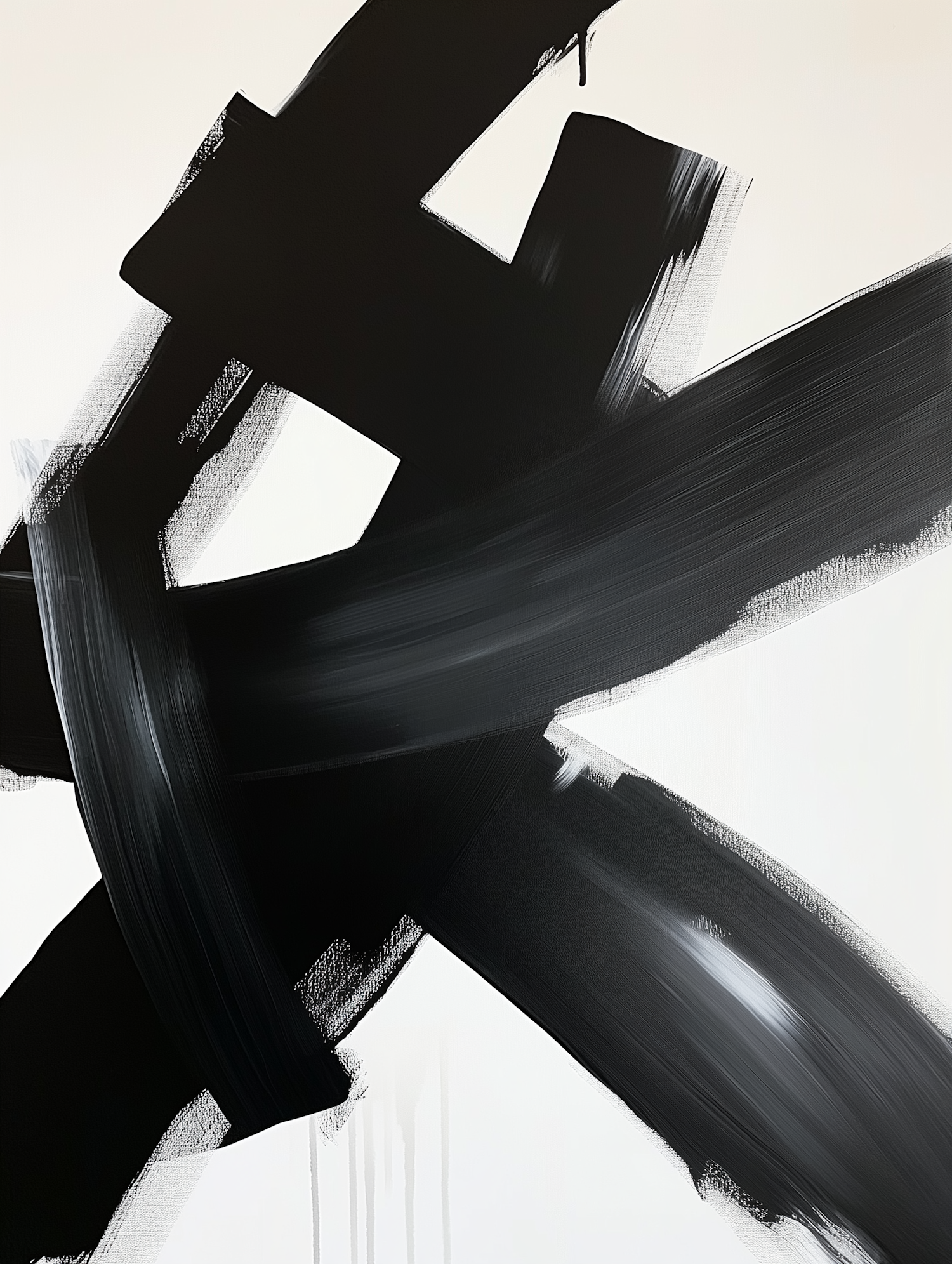 Dynamic abstract art with bold black brushstrokes on a white background, showcasing texture and movement in a minimalist composition.