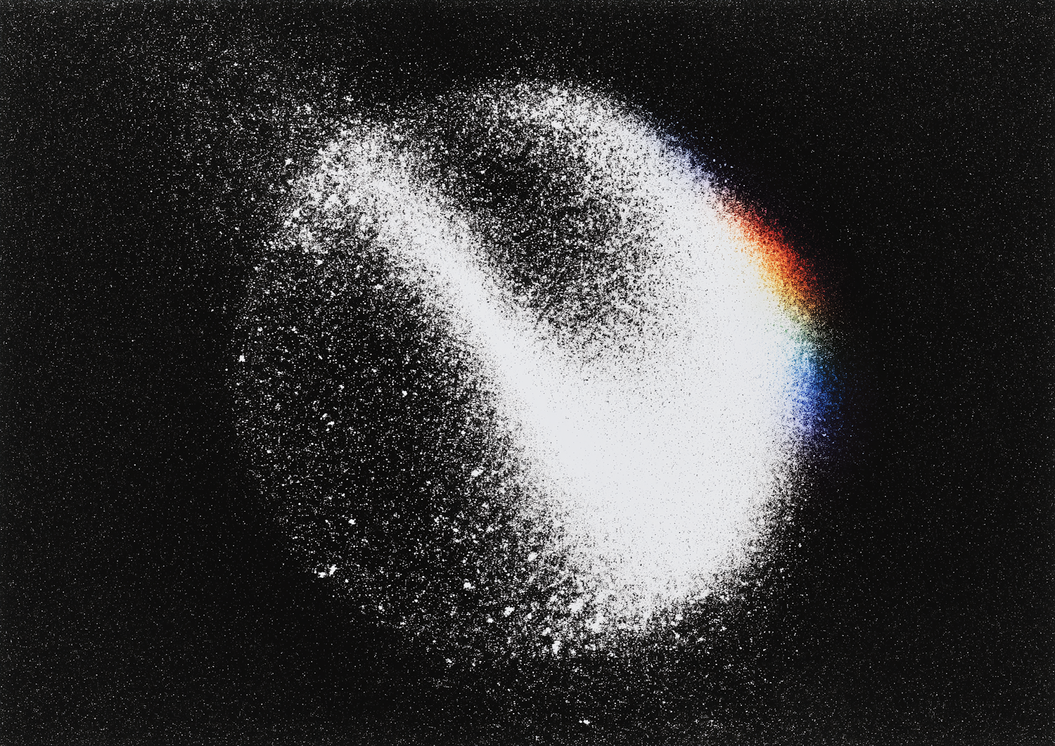 Abstract image resembling cosmic patterns with a gradient rainbow on black background, resembling stardust or galactic phenomena.