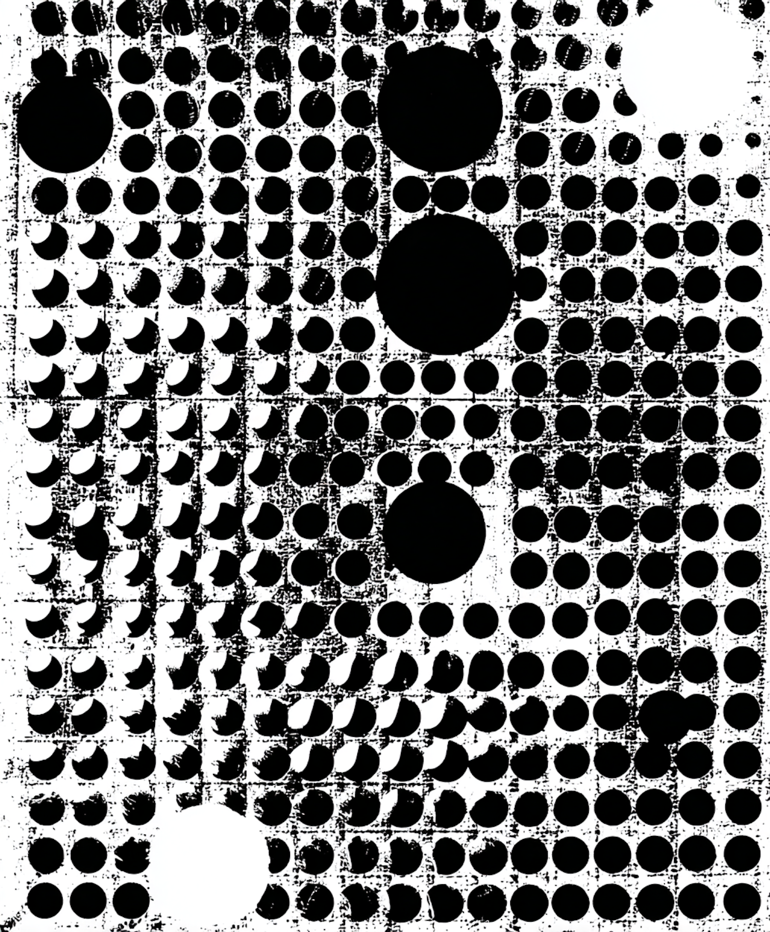 Abstract black and white artwork with textured circular patterns in a grid, creating a bold and dynamic visual effect.