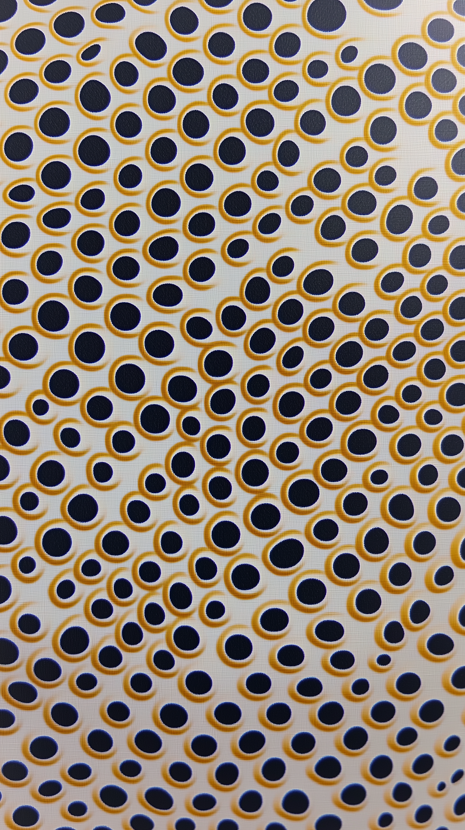 Abstract pattern of black circles with golden-yellow outlines on a white textured background, creating a dynamic and glowing effect.