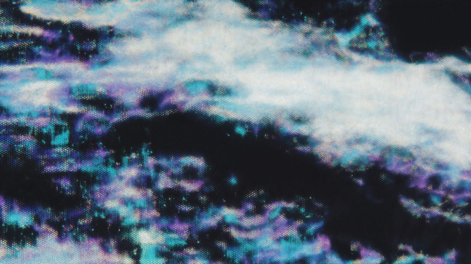 Abstract art with vibrant aquamarine, purple, and blue textures on a dark background, creating a dreamy and colorful scene.