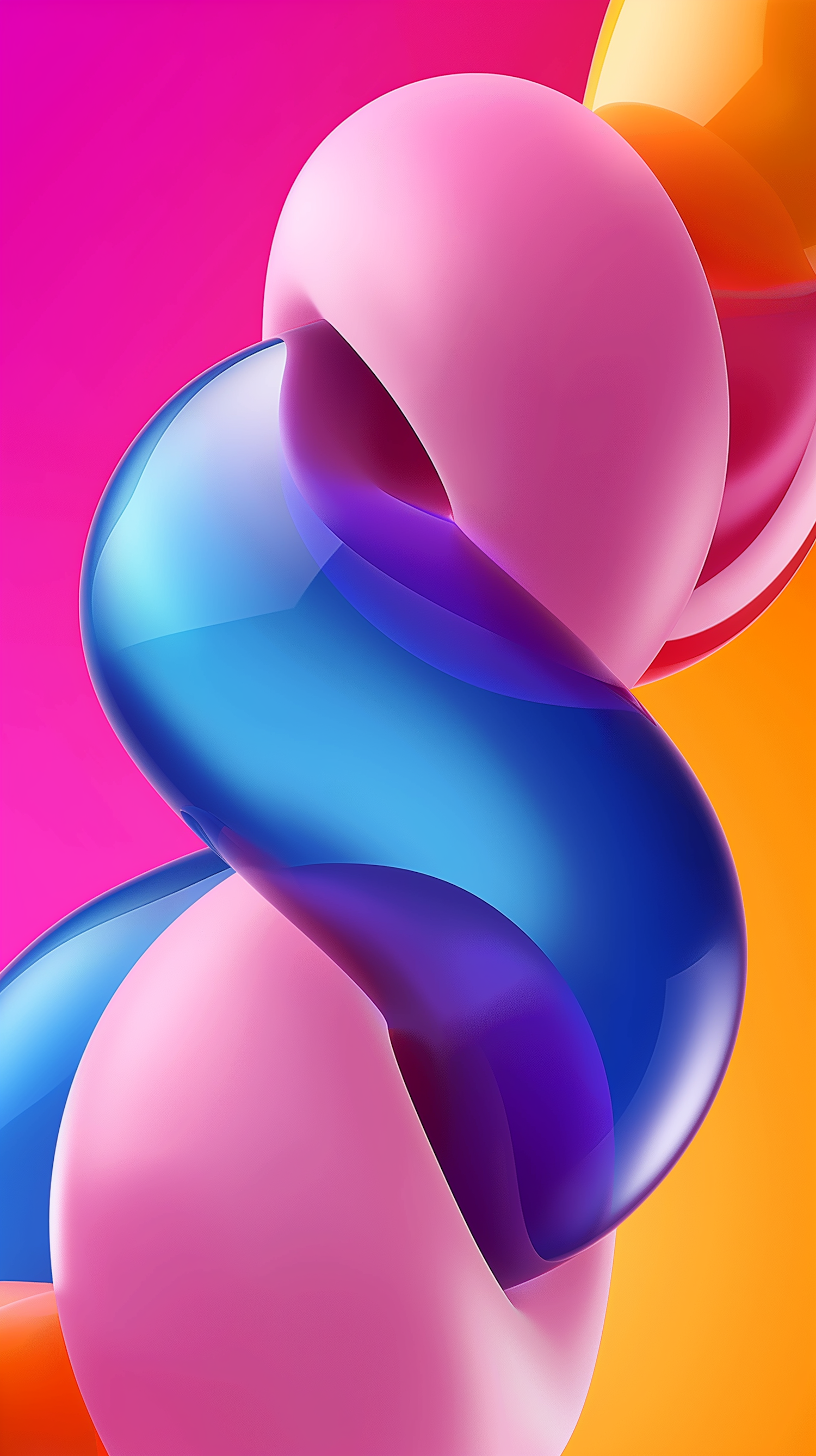 Vibrant abstract design with glossy, intertwined ribbons in blue, pink, and purple against a pink-orange gradient background.