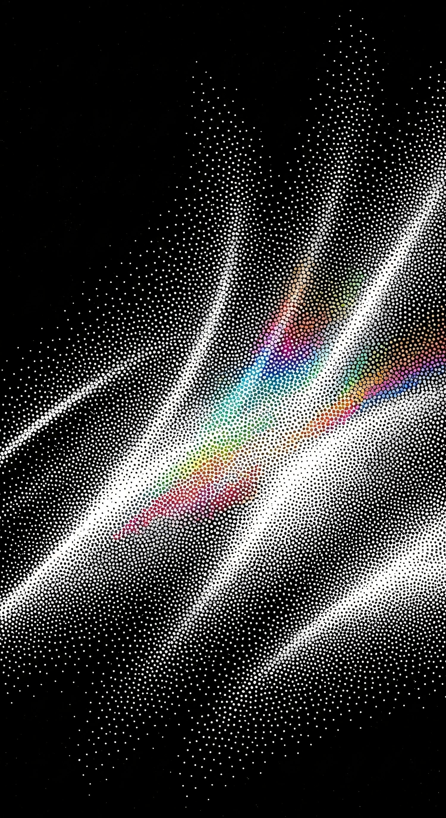 Abstract art with flowing white dots on black, featuring a vibrant rainbow gradient in the center, creating a dynamic and striking visual.