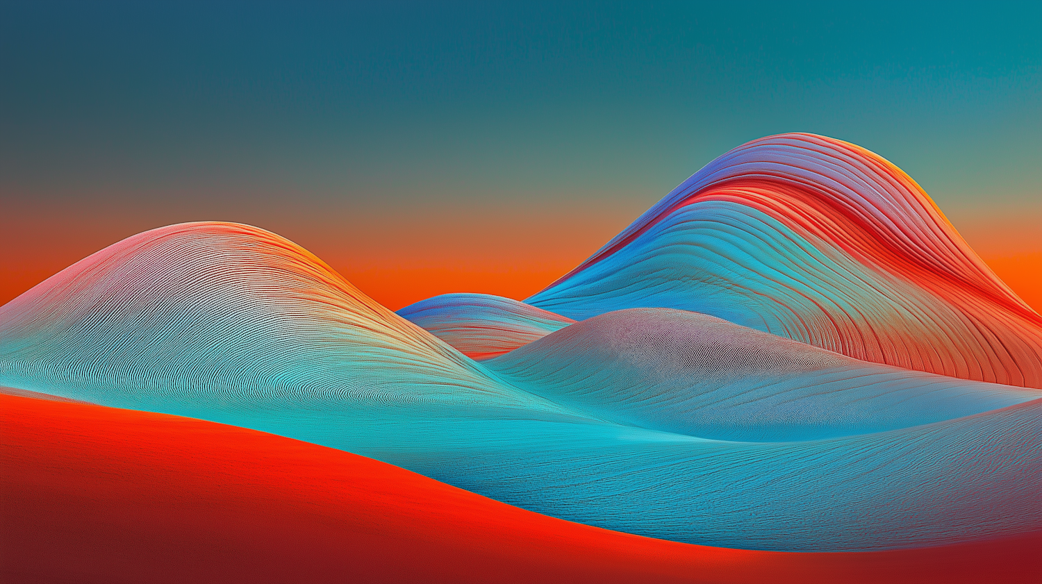 Vivid digital illustration of colorful, textured hills with flowing patterns and a gradient sky, evoking a surreal and dreamlike landscape.