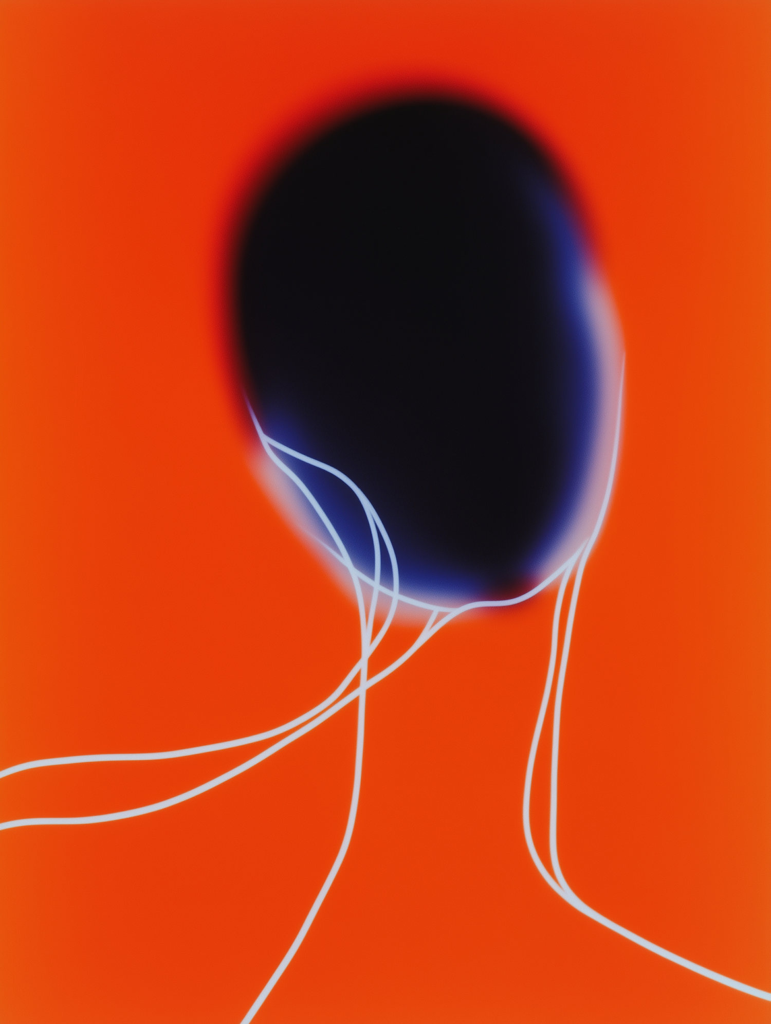 Abstract art with a dark oval on a vivid orange background, surrounded by white lines and a blue glow, creating a dynamic visual effect.