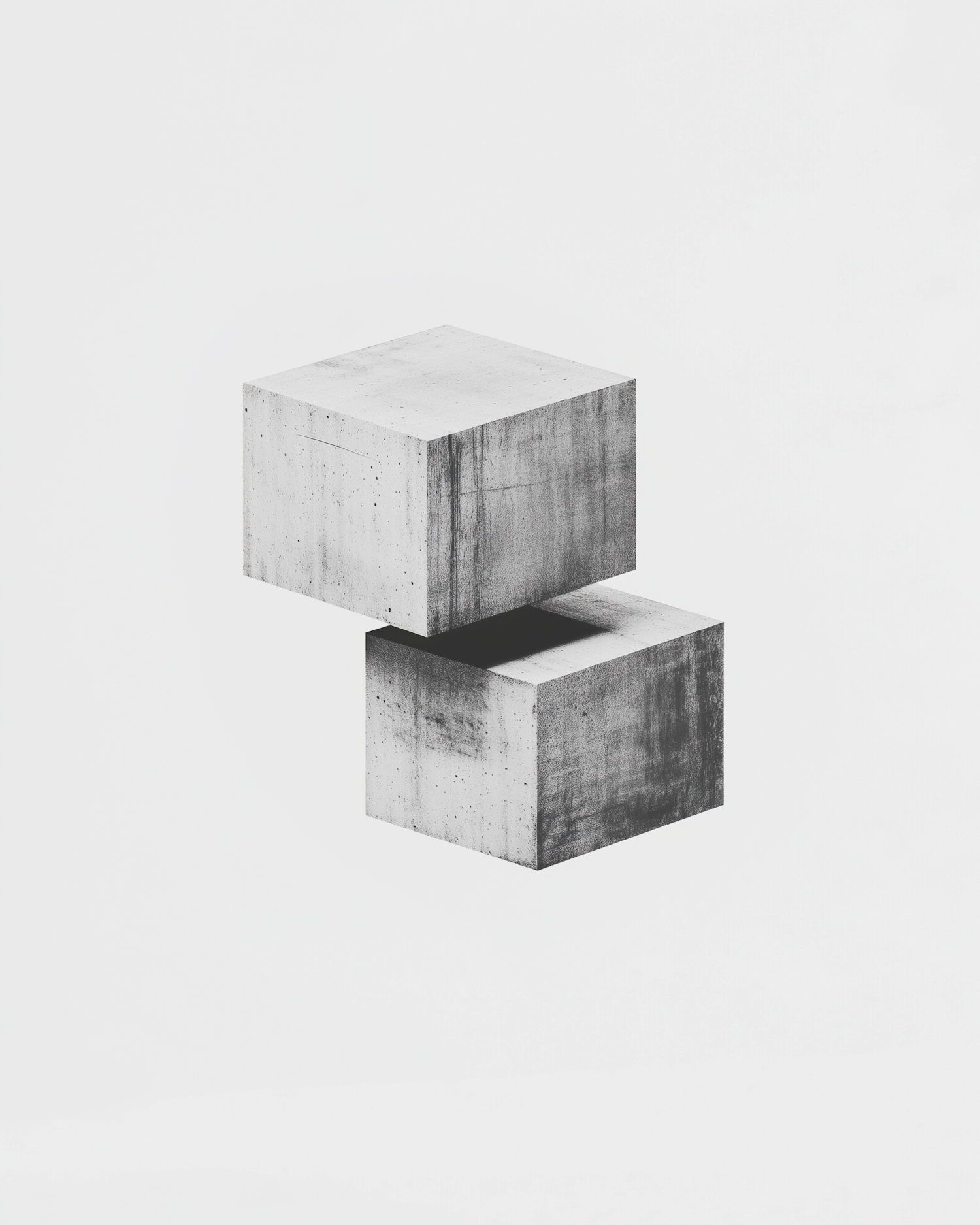Minimalist composition of two stacked concrete cubes on a white background, showcasing geometric simplicity and industrial texture.