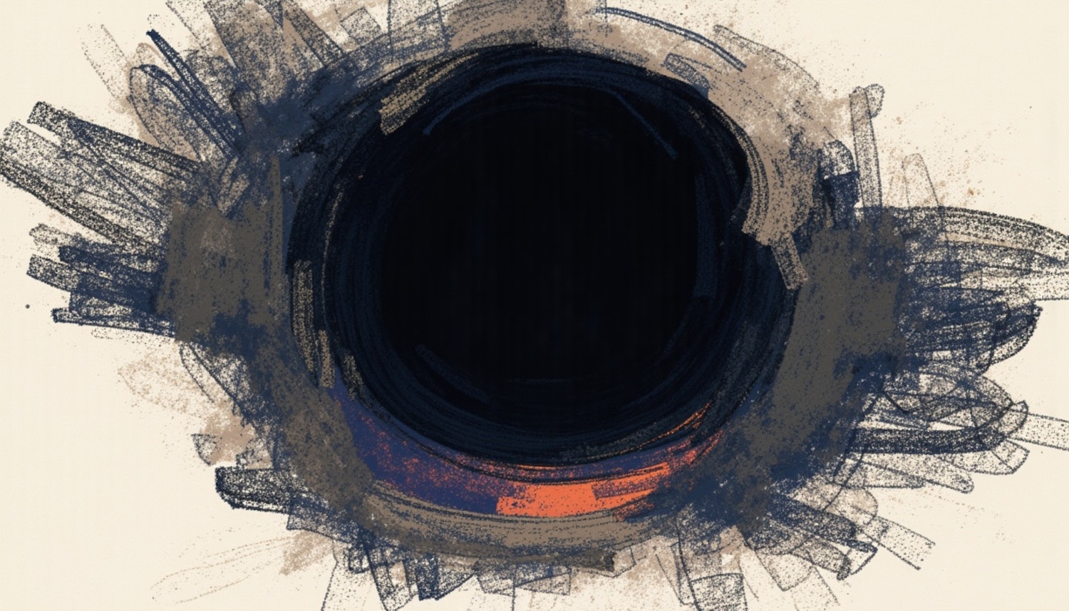 Abstract art with a dark circular center surrounded by dynamic blue and orange brushstrokes on a beige background.
