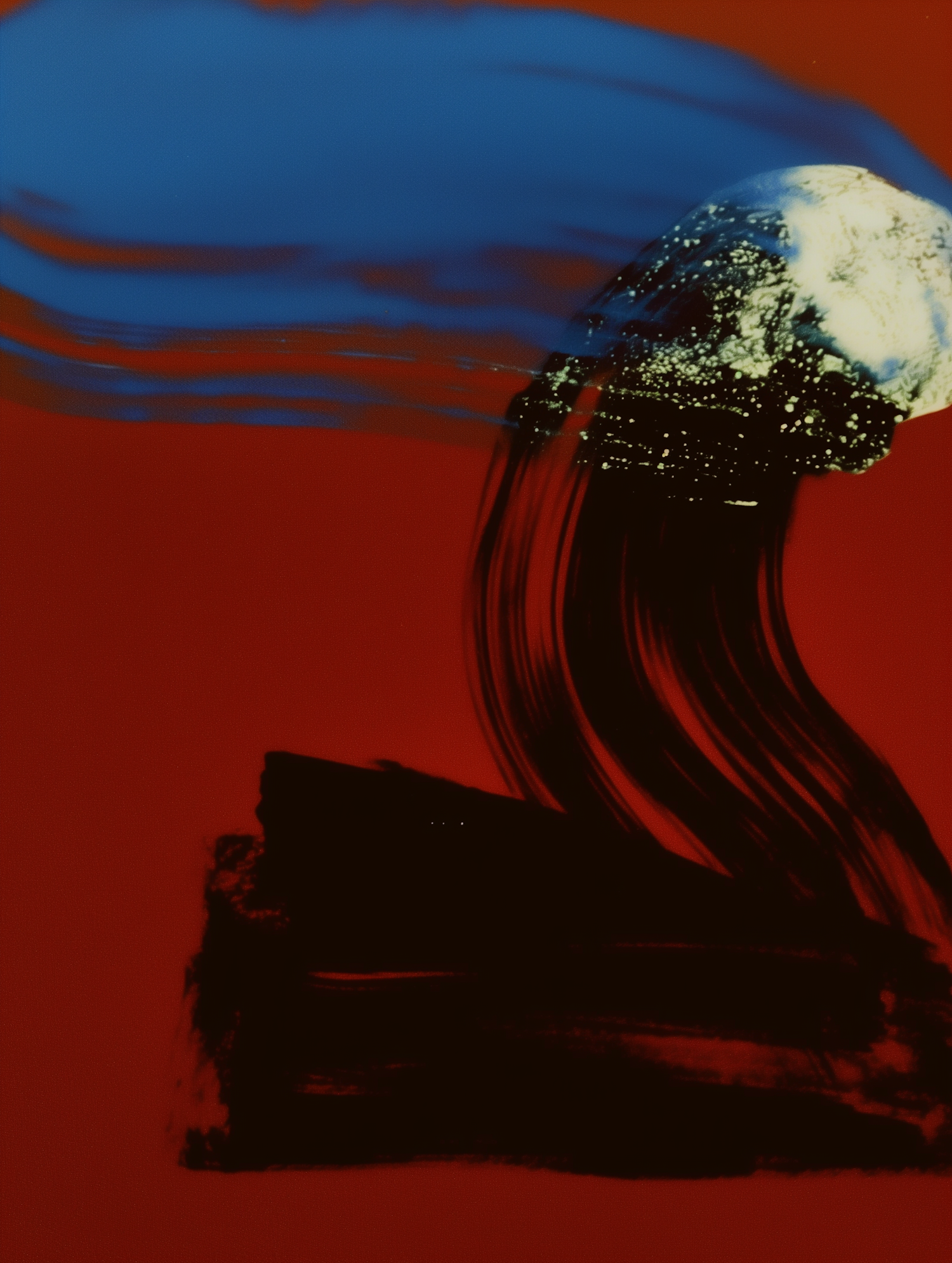 Abstract art with bold red, black, and blue tones, featuring dynamic brushstrokes and a textured white focal point resembling a jellyfish.