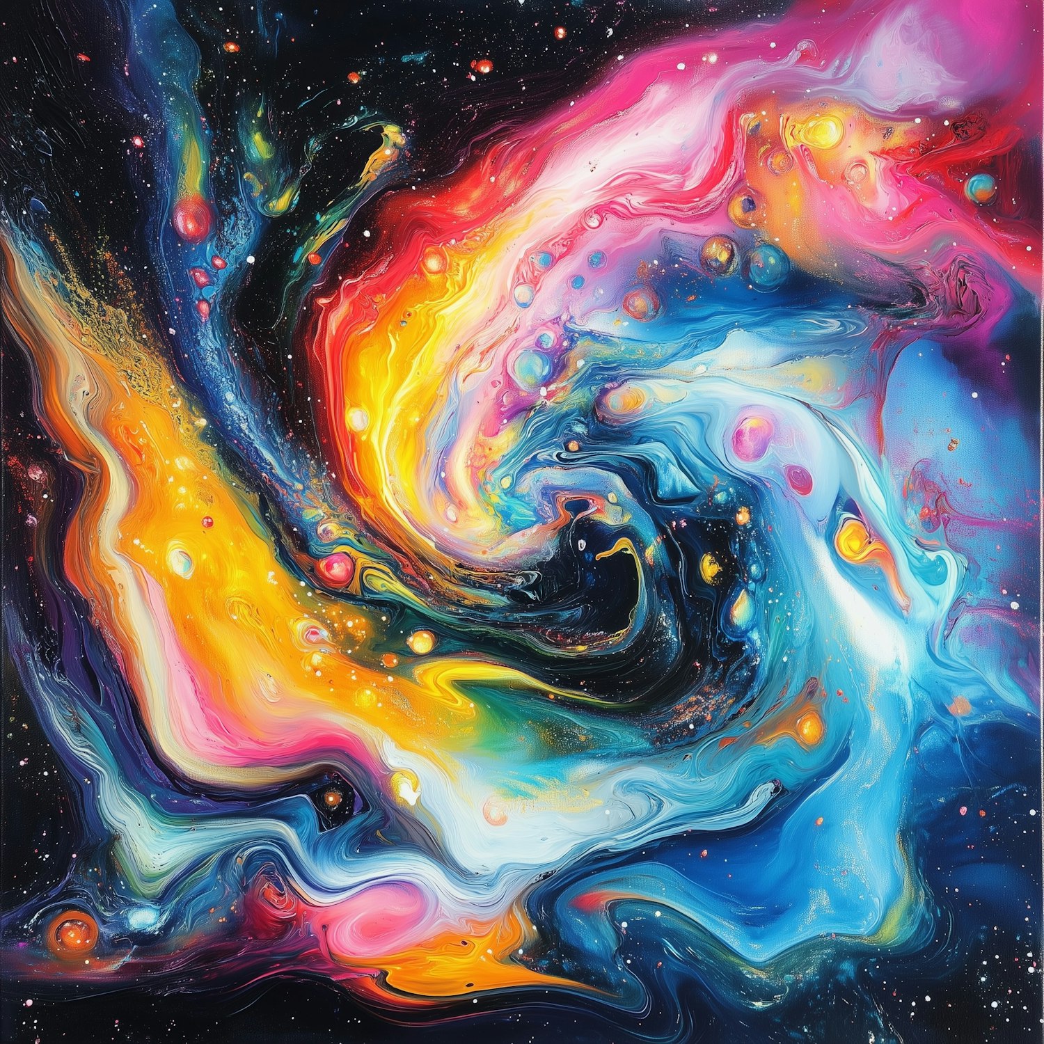 A mesmerizing abstract galaxy with swirling colors of yellow, red, blue, and pink, dotted with glowing orbs against a dark cosmic backdrop.