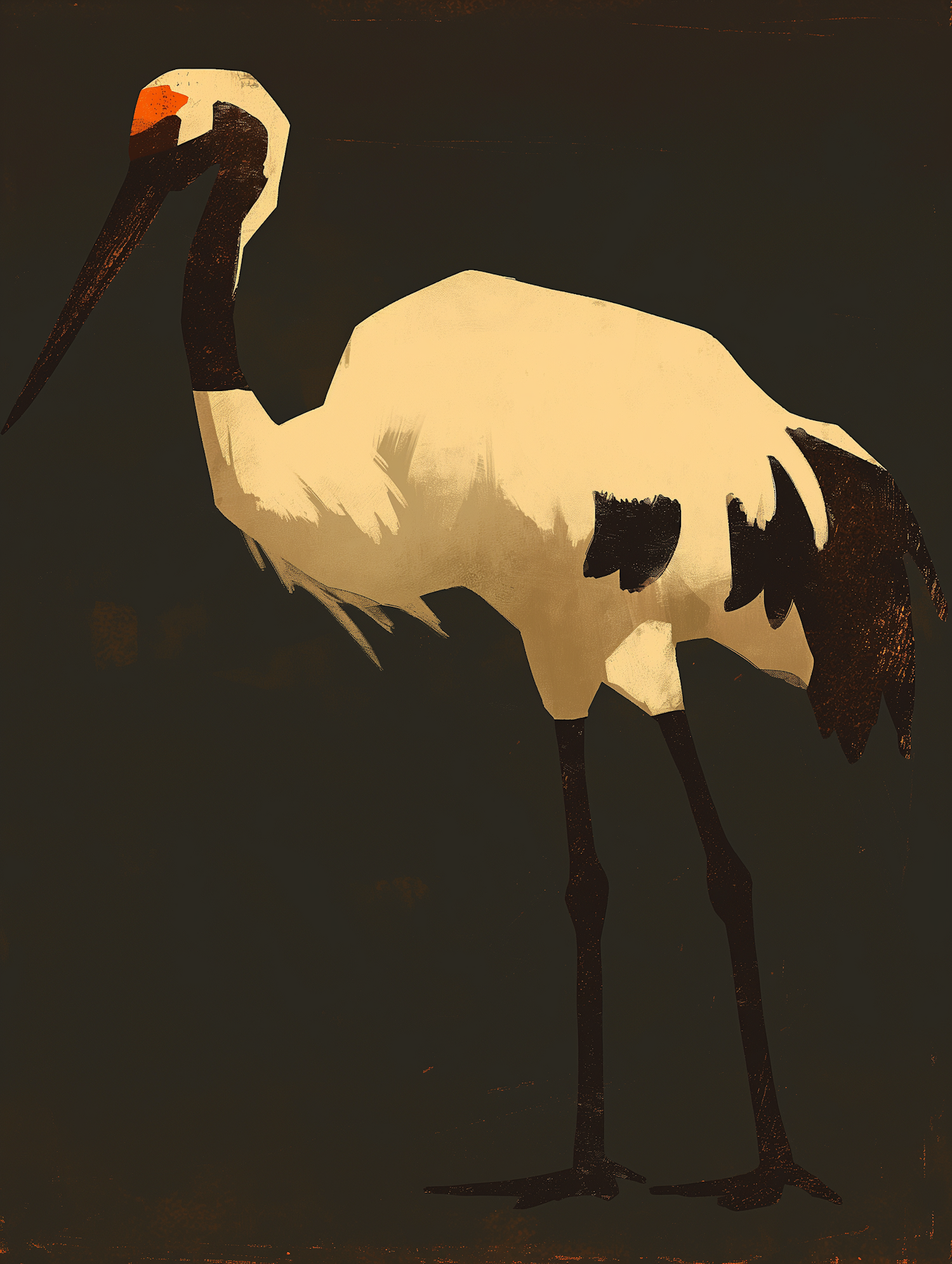 Stylized illustration of a crane with white and black plumage, a red head patch, and a dark background, emphasizing its elegant form.