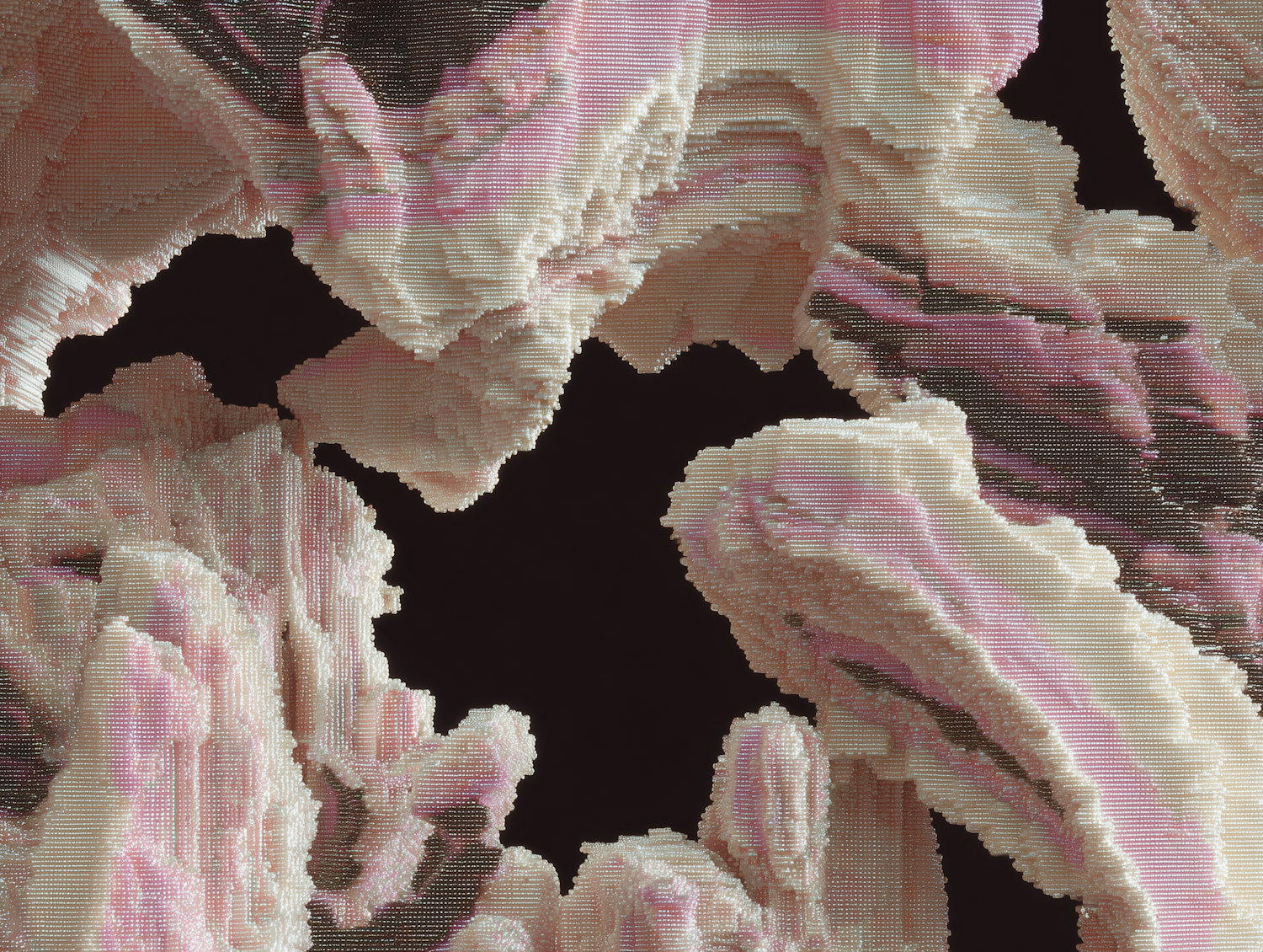 Abstract digital art with pink and cream crystalline textures against a dark background, creating a striking and intricate visual effect.