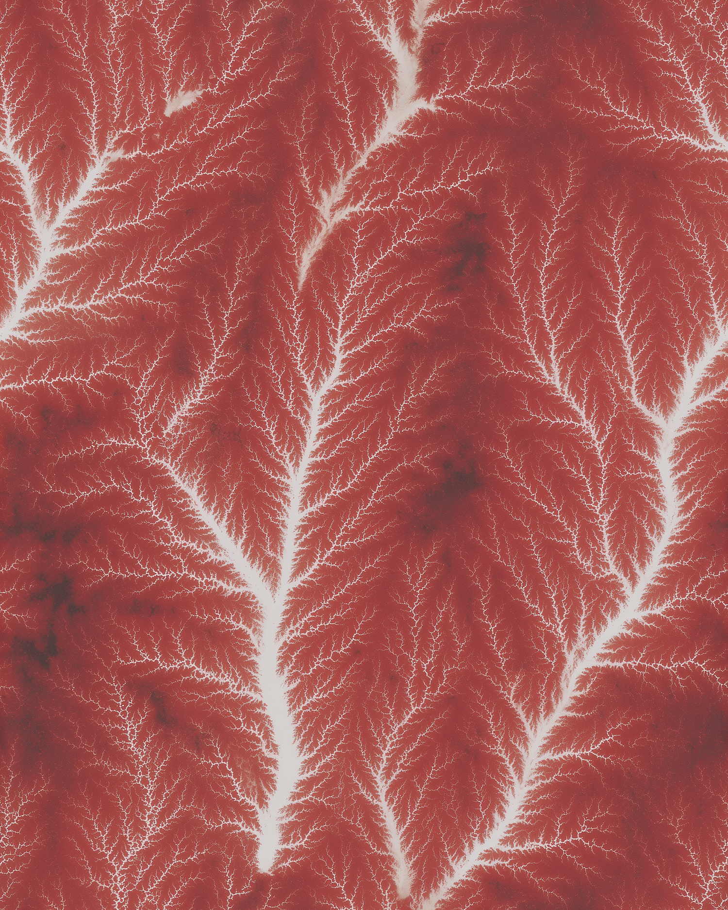 Red and white abstract dendritic patterns resembling natural forms like veins or rivers, creating a vibrant, organic visual.