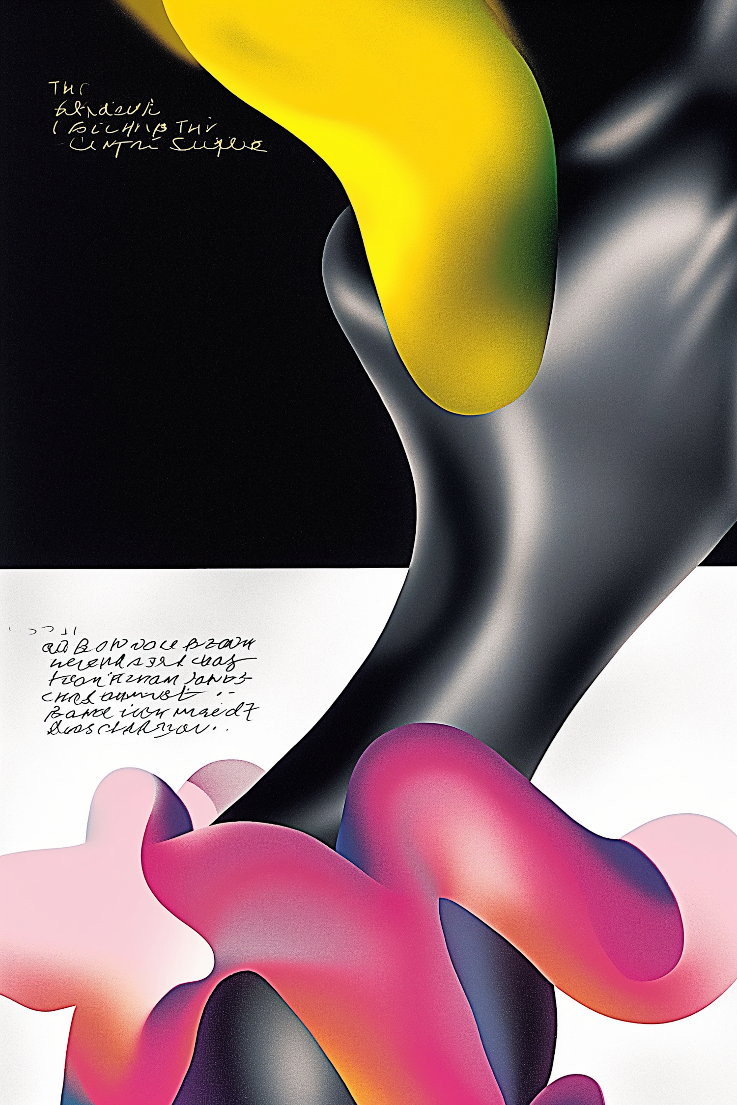 Abstract art with bold yellow, pink, and black shapes, featuring handwritten text. A modern, fluid composition with vibrant colors.
