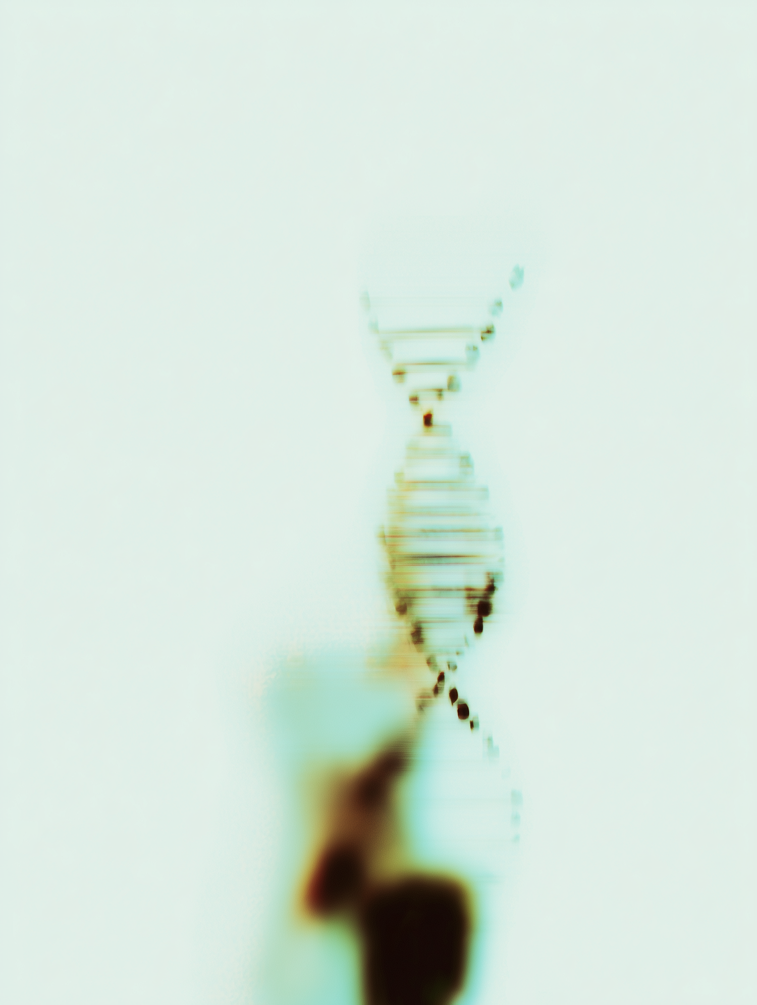Abstract representation of a DNA helix in soft teal and brown tones on a light background, blending science and art.