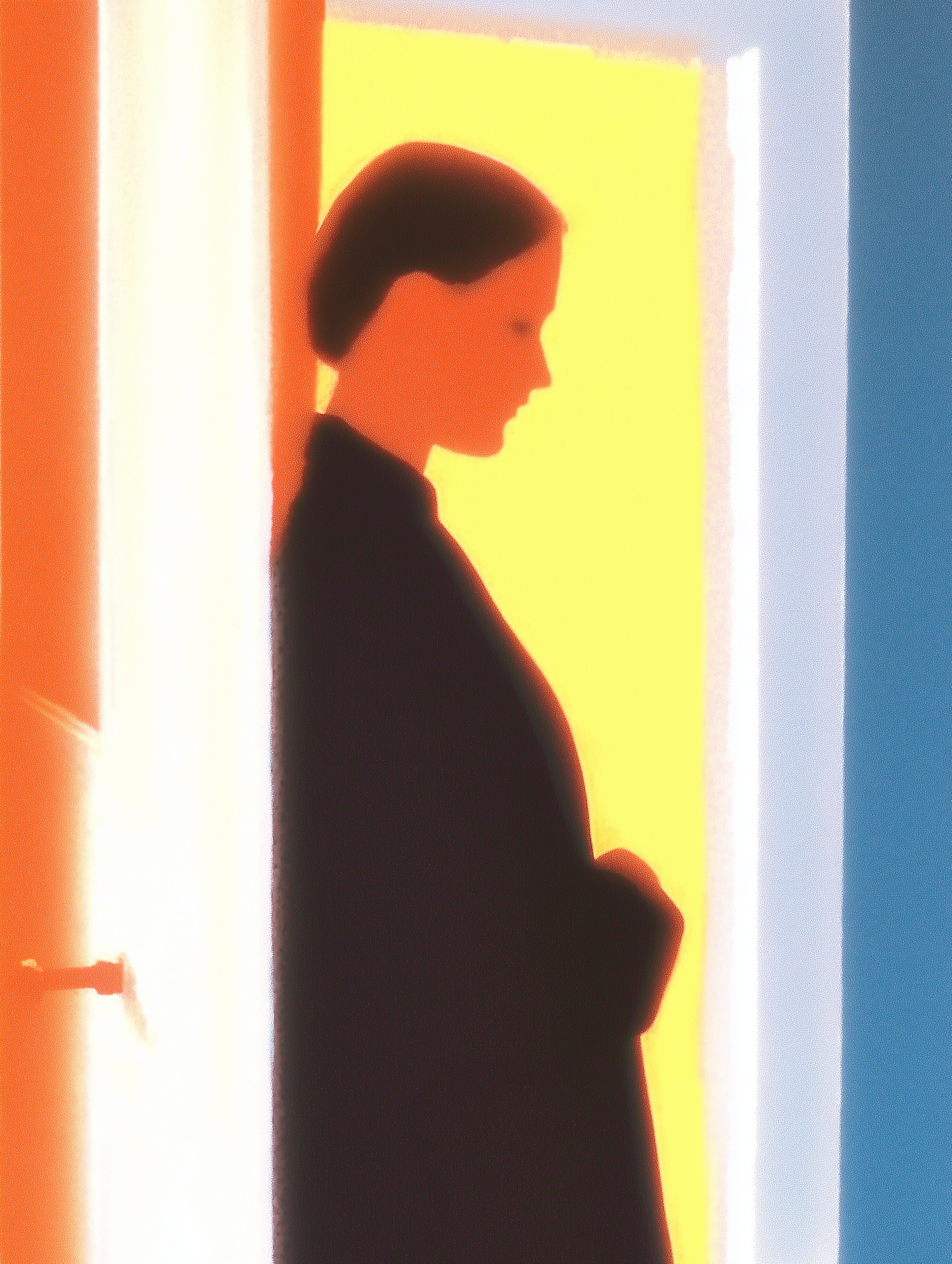 Abstract illustration of a silhouetted figure in a doorway with vibrant orange, yellow, and blue tones creating a serene atmosphere.