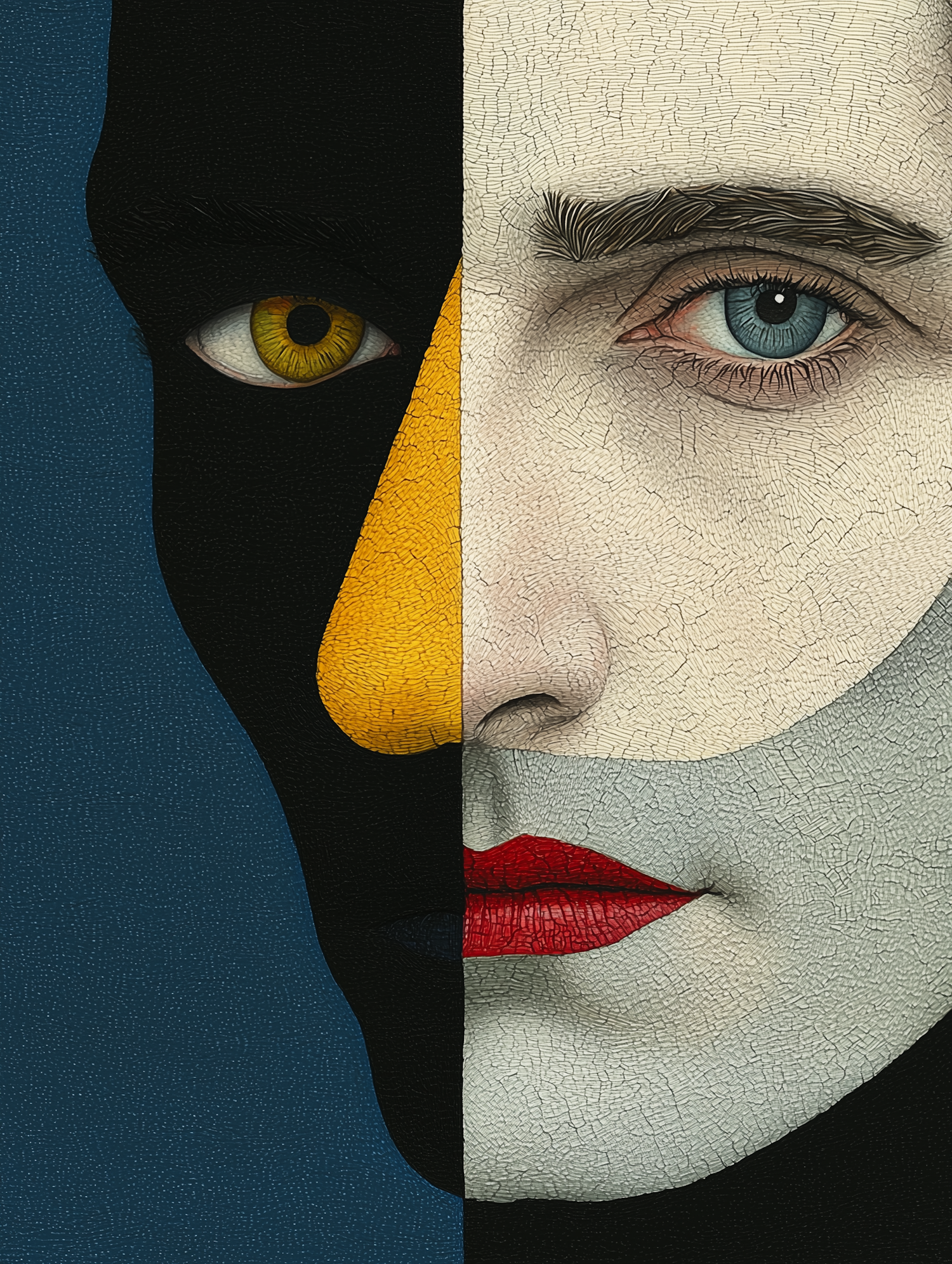 A surreal illustration of a face split into contrasting halves with bold colors and cracked texture, exploring themes of duality.