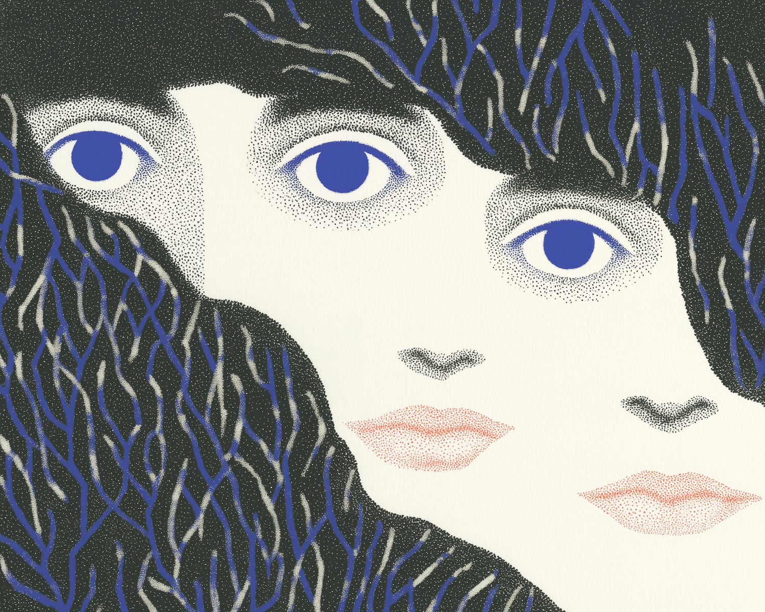 Abstract illustration of three overlapping faces with blue eyes and textured hair, rendered in a pointillism style with dynamic lines.