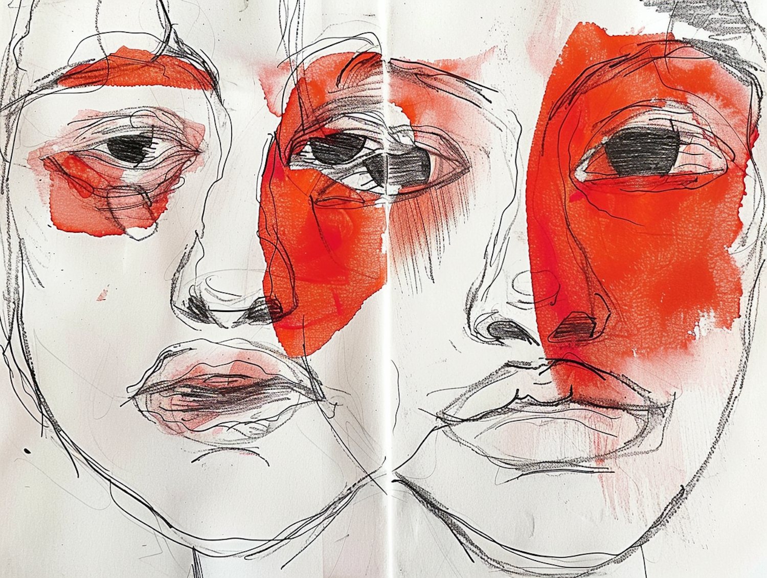 Abstract illustration of two overlapping faces with bold red watercolor accents, expressive black lines, and a raw, emotional aesthetic.