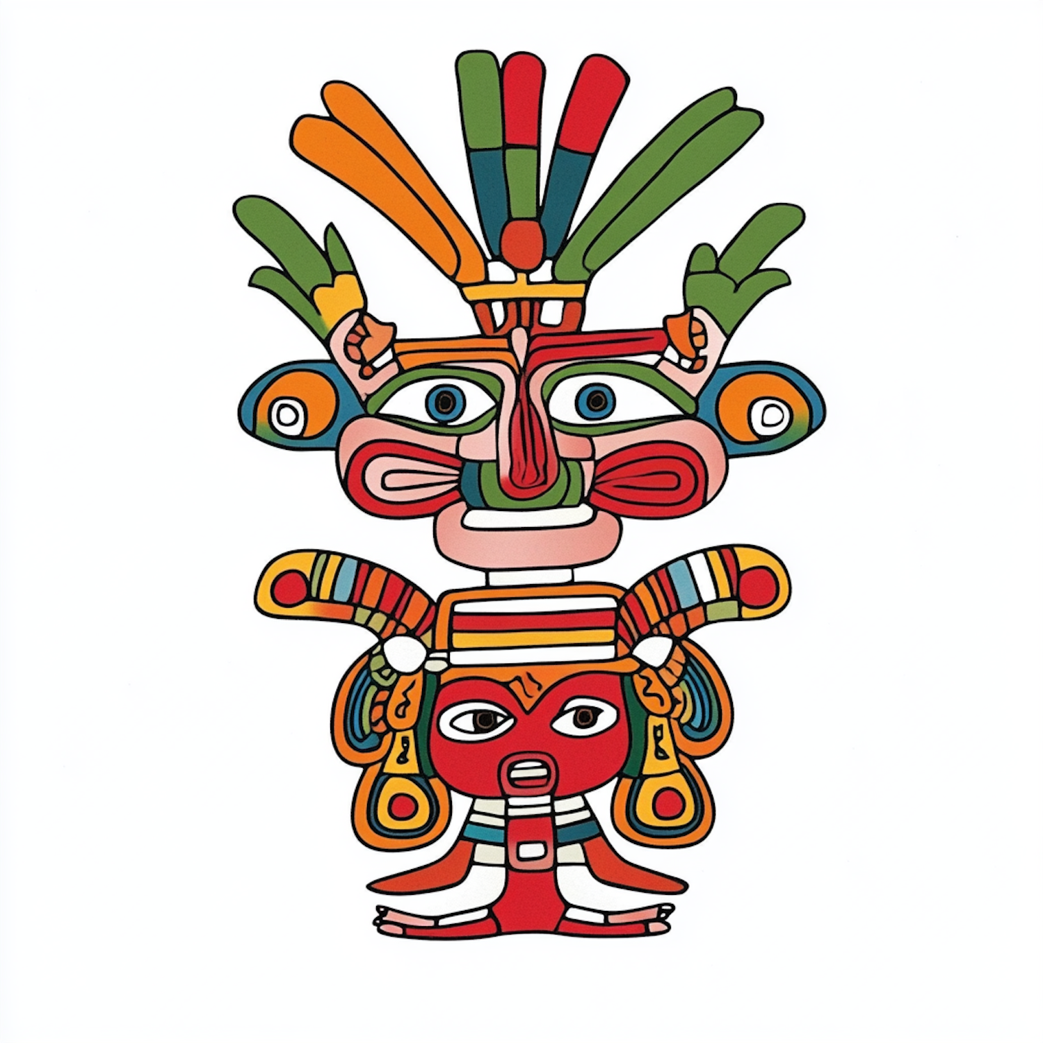 Colorful abstract illustration with geometric patterns and vibrant colors, featuring a totem-like figure with expressive eyes and a feathered headdress.