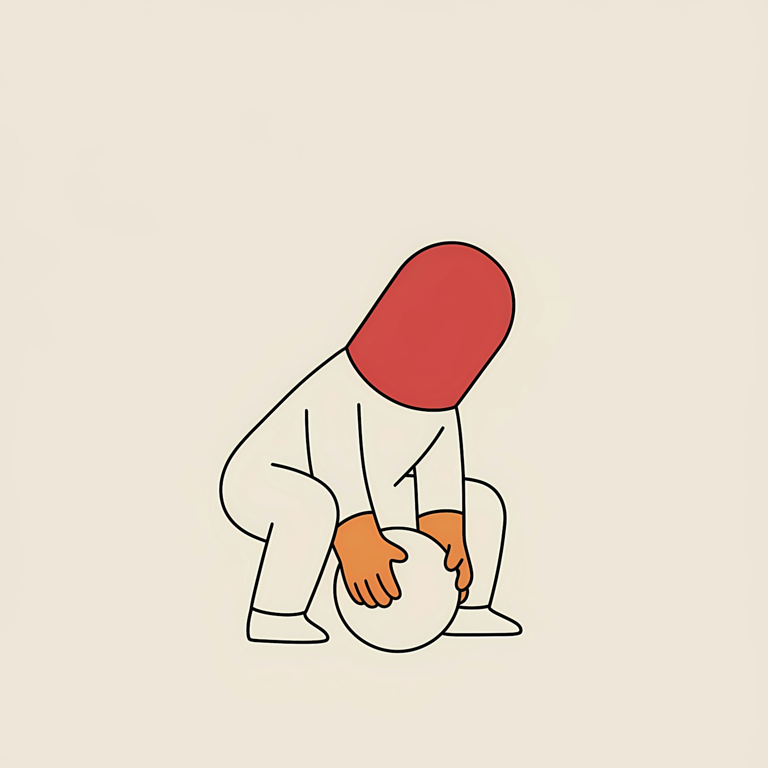 Minimalist illustration of a stylized figure with a red head and orange hands crouching to hold a white sphere on a beige background.