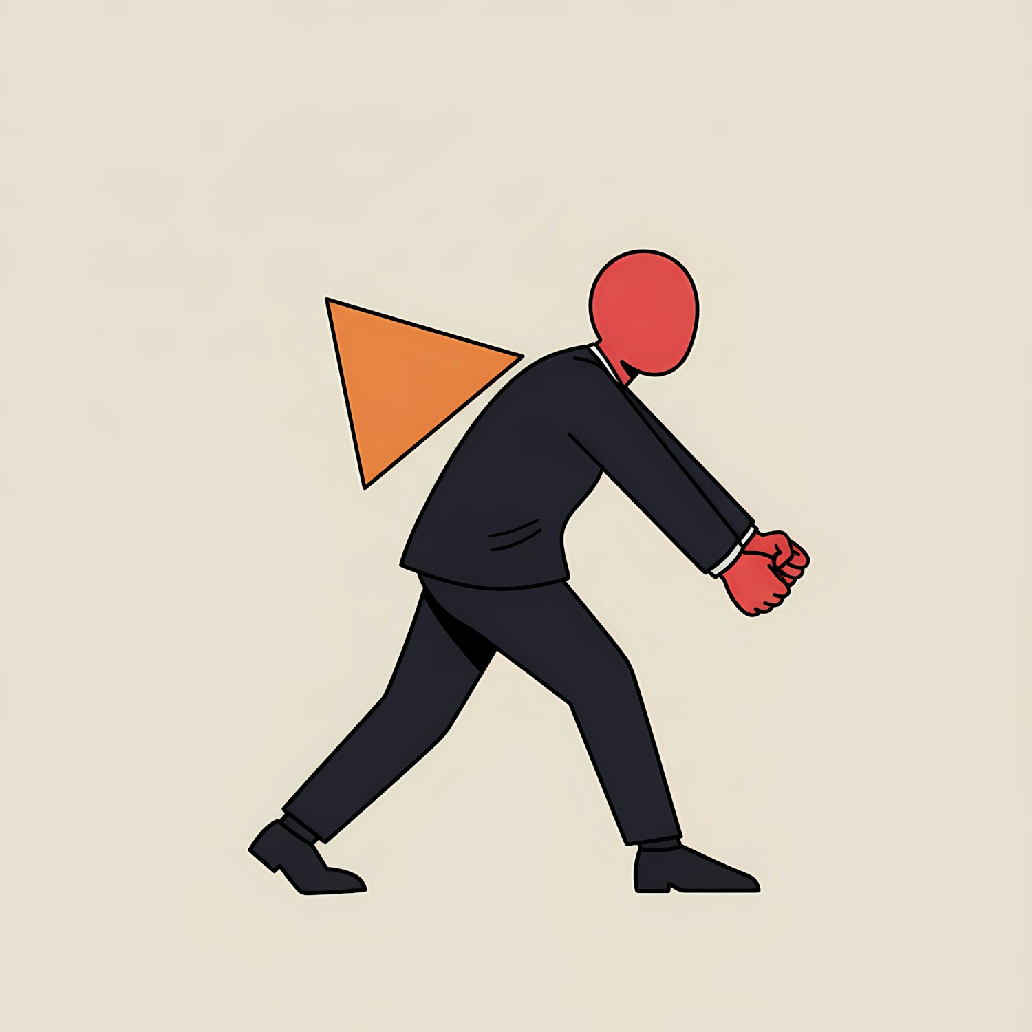 Stylized illustration of a figure in a suit with a red head and hands, walking forward with an orange triangle behind them.