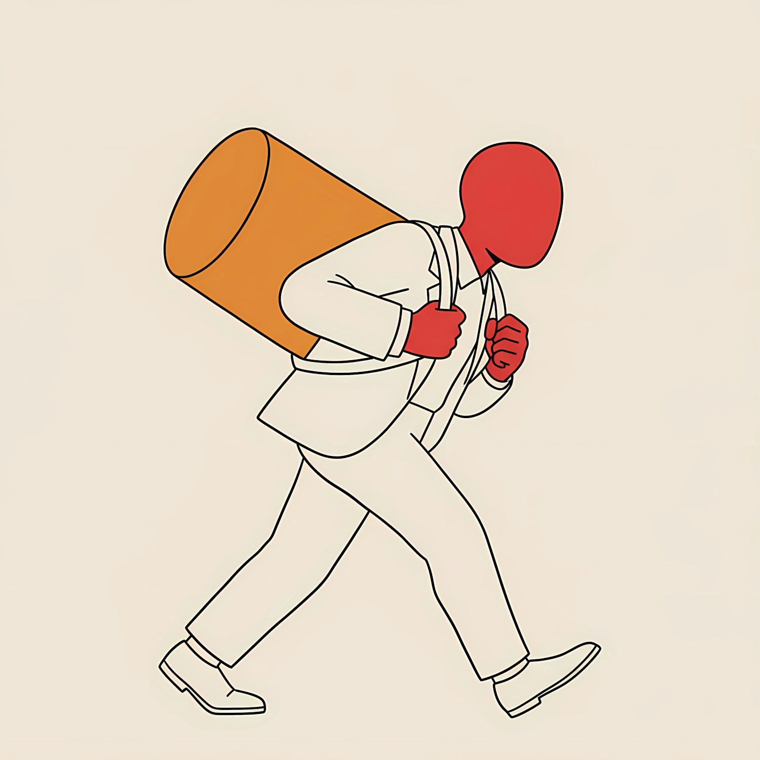 Minimalist illustration of a figure in a white suit carrying an orange cylinder, set against a beige background.