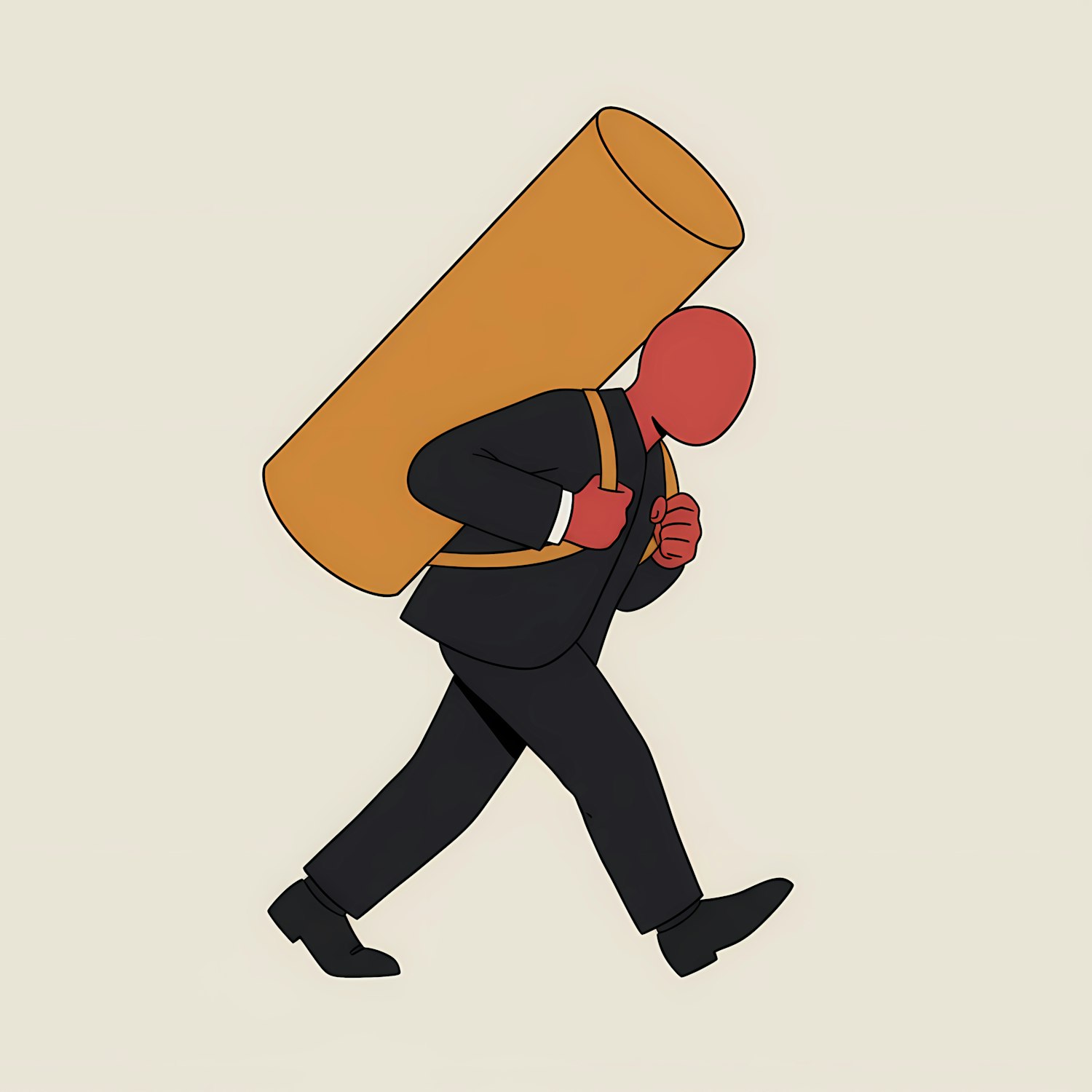 Abstract illustration of a figure in a suit carrying a large orange cylinder on their back, set against a plain beige background.