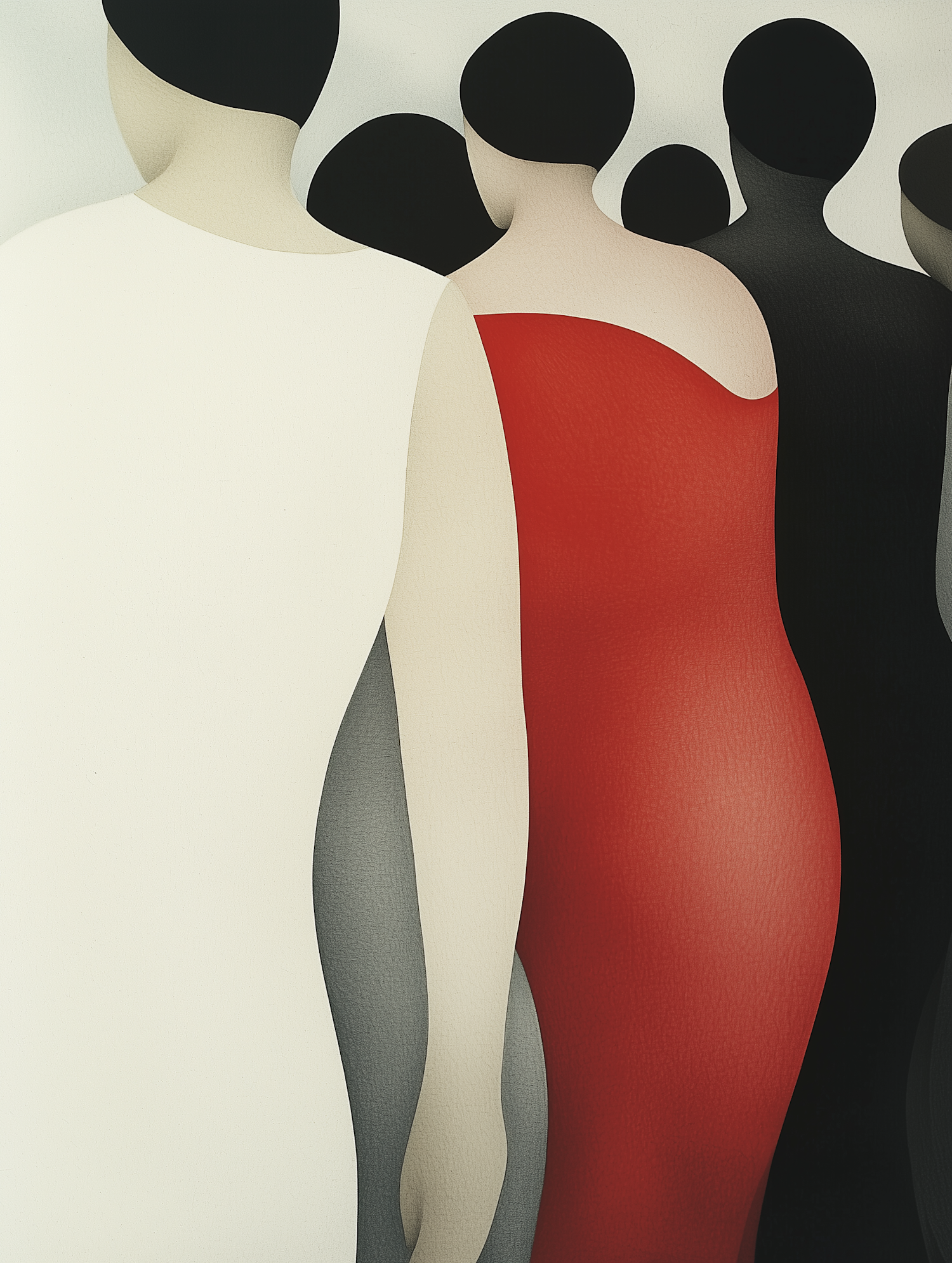 Minimalist abstract illustration of faceless figures in white, red, gray, and black, emphasizing curves and contrasts in a modern style.