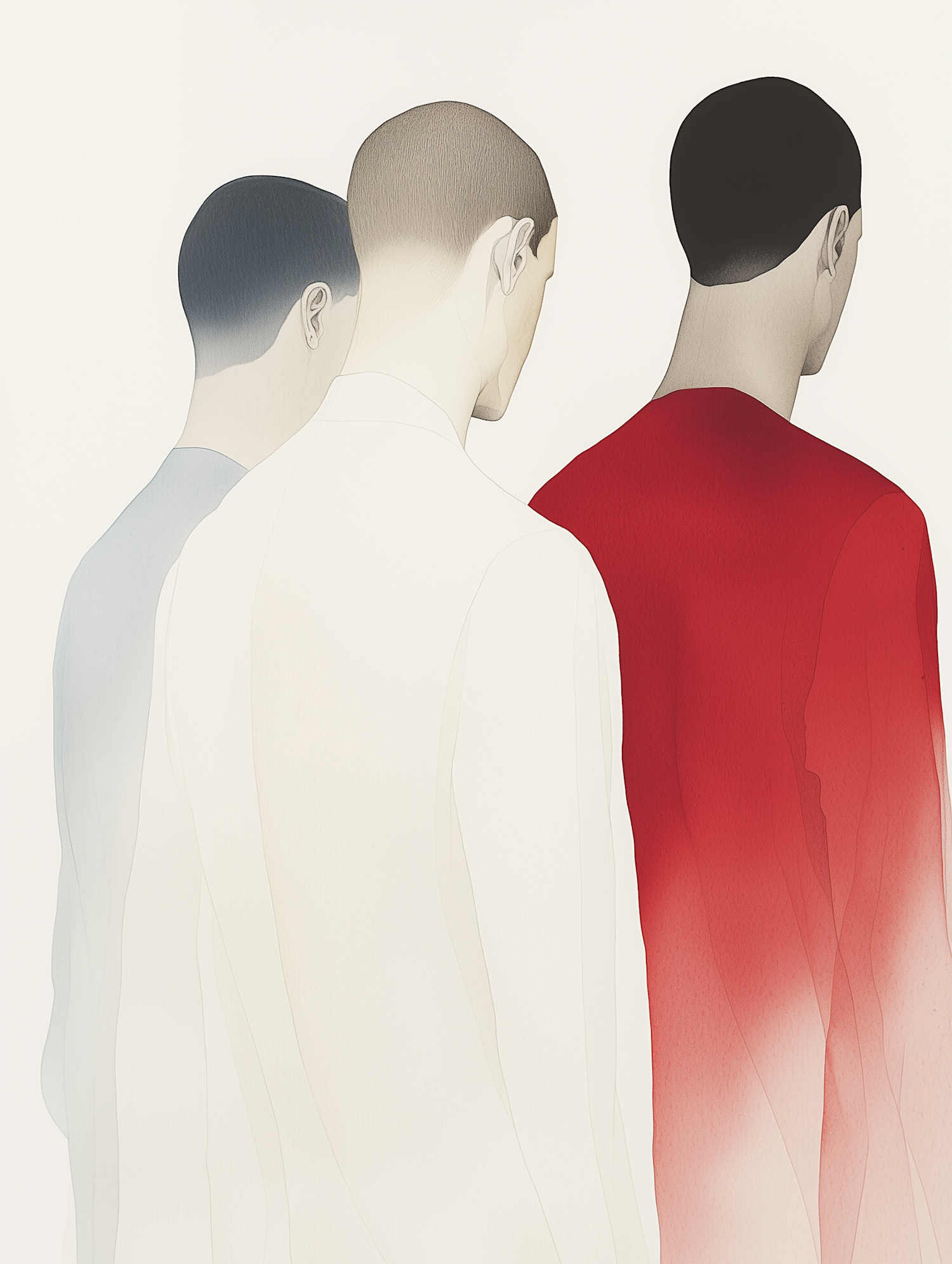 Minimalist artwork of three figures with their backs turned, featuring muted tones and a bold red accent for contrast.