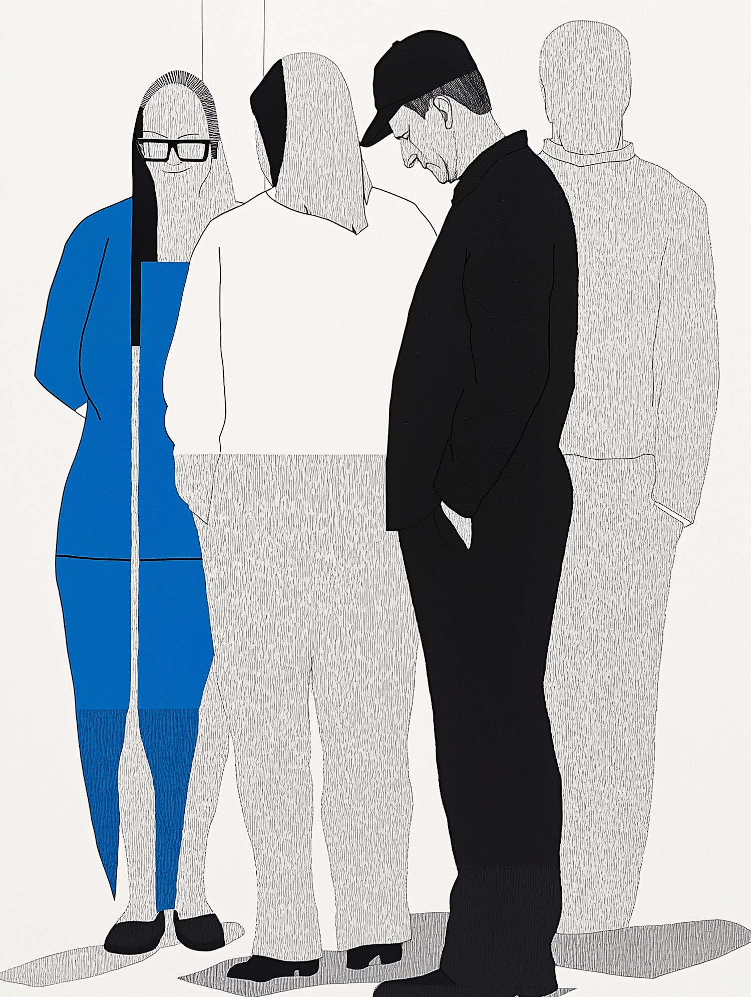 Minimalist illustration of four abstract figures, one in blue with glasses, others in black and white, against a plain background.