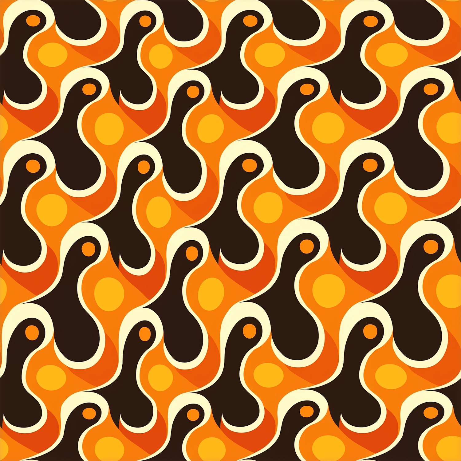 Retro abstract pattern with swirling shapes in orange, brown, and cream, creating a seamless, vintage 1970s psychedelic design.