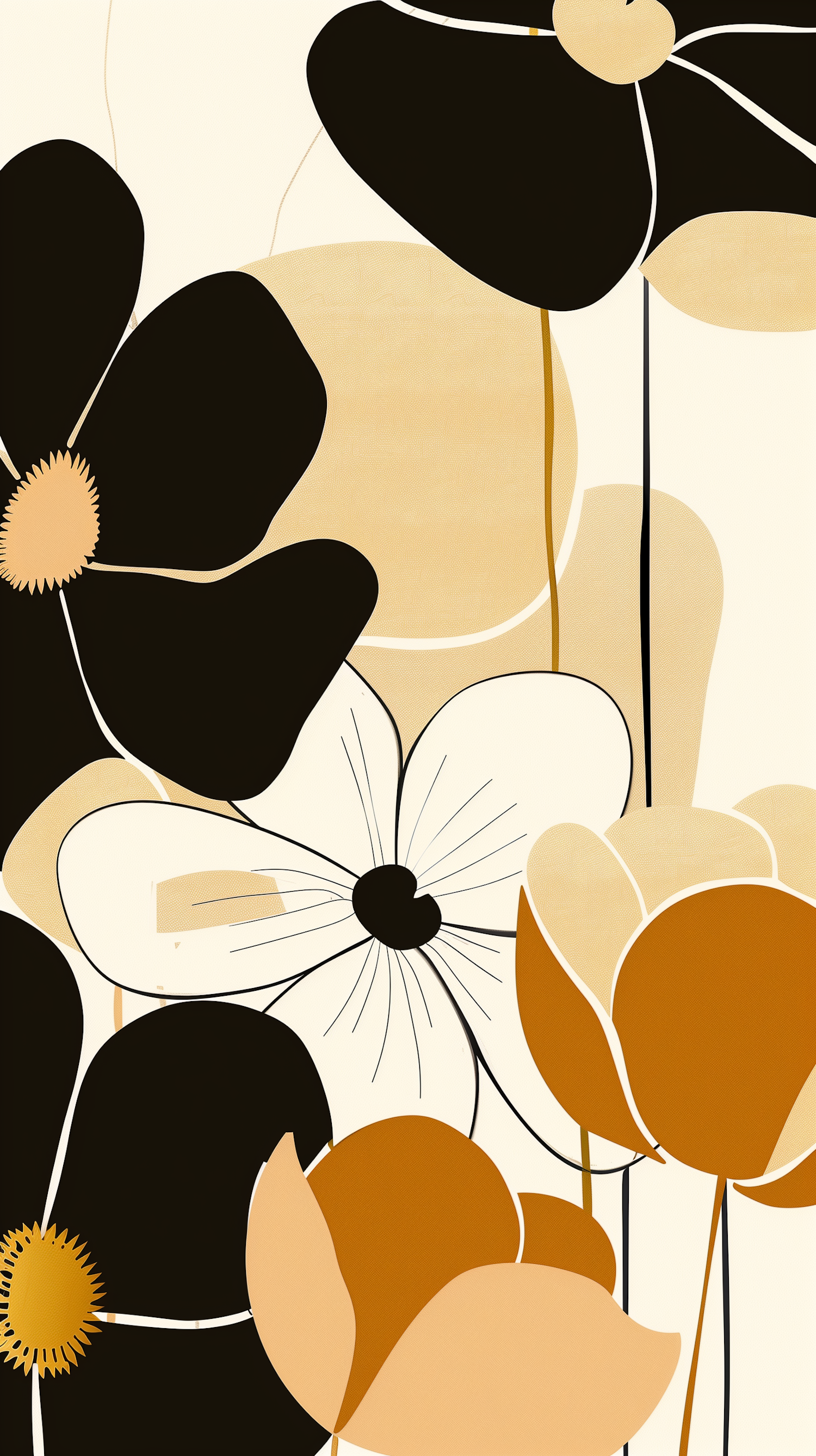 Minimalist floral illustration with bold black, white, and orange flowers on a soft beige background. Perfect for modern decor.