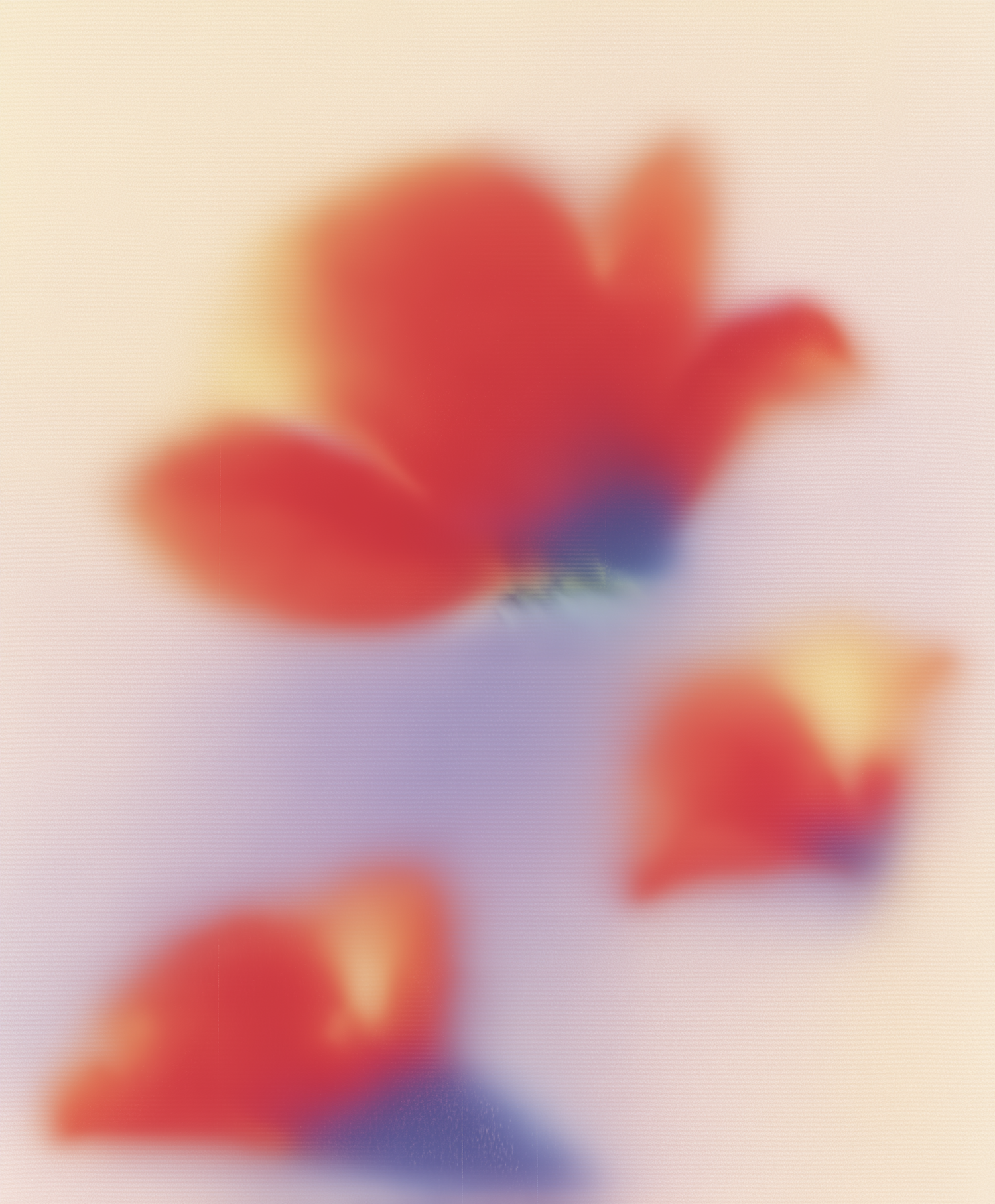 Abstract blurred flowers in red and orange tones on a soft gradient background, creating a dreamy and serene visual effect.