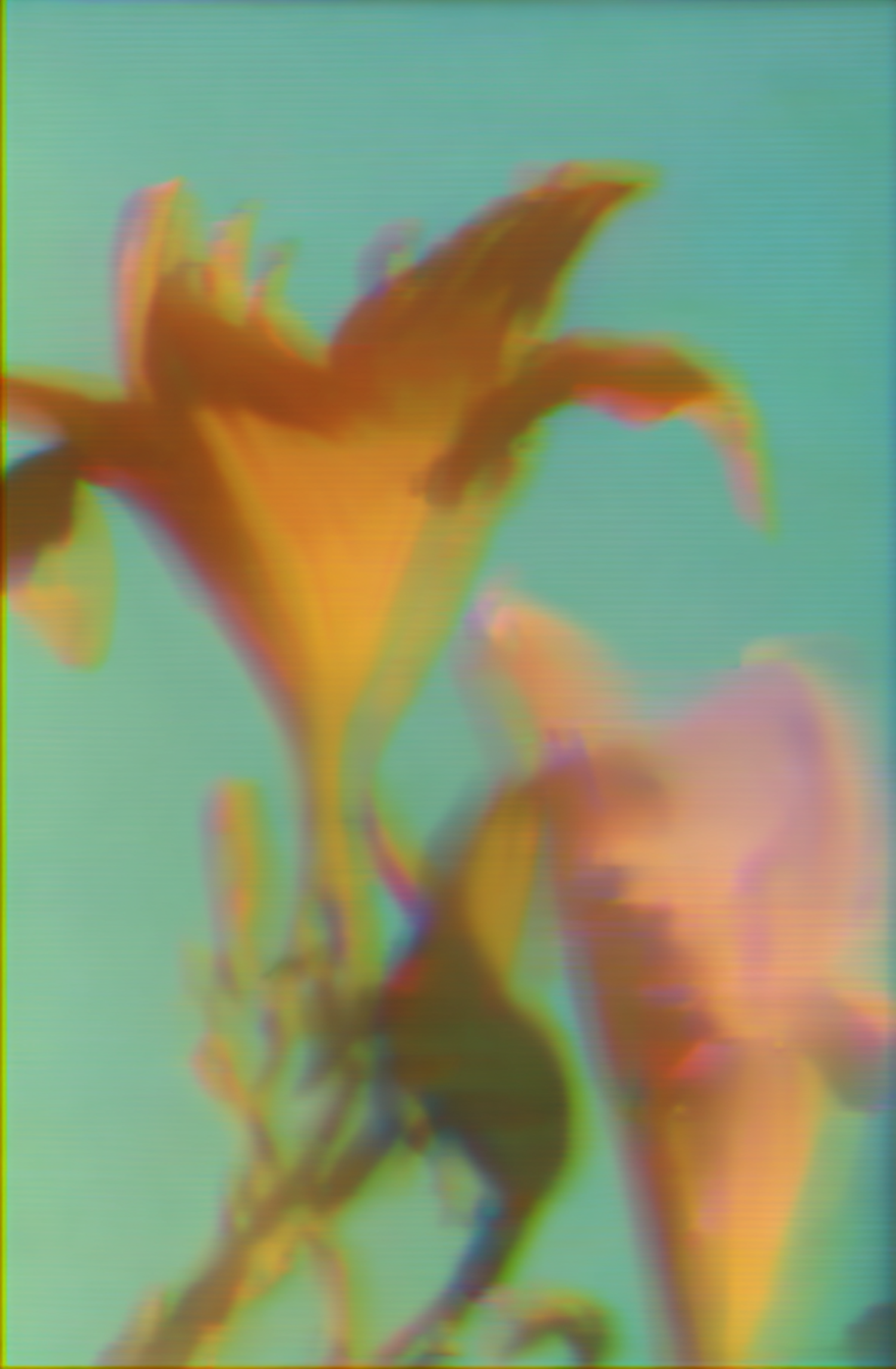 Abstract depiction of vibrant flowers with a surreal color palette and digital distortion effects, creating a modern artistic aesthetic.