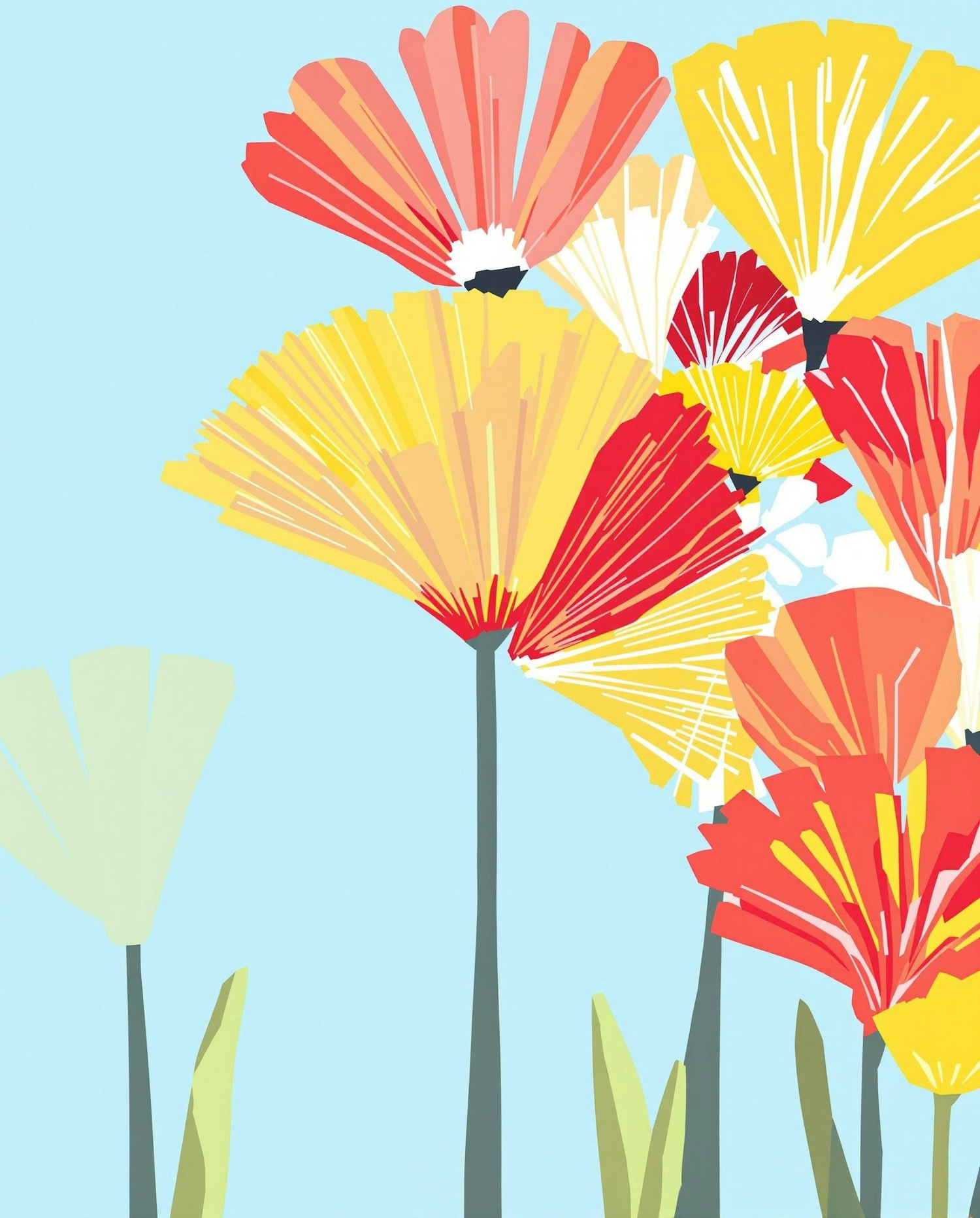 Vibrant illustration of fan-like stylized flowers in bold shades of red, yellow, and white, arranged in a semi-circular arc across a bright sky blue background. Petals have simplified, graphic shapes with thick outlines and layered textures. Strong visual rhythm and color contrast, no shadows, no text.”