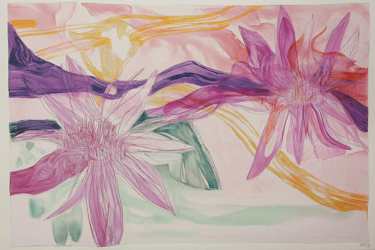 Abstract illustration of vibrant pink and purple flowers with dynamic lines and bold colors, creating a sense of movement and energy.