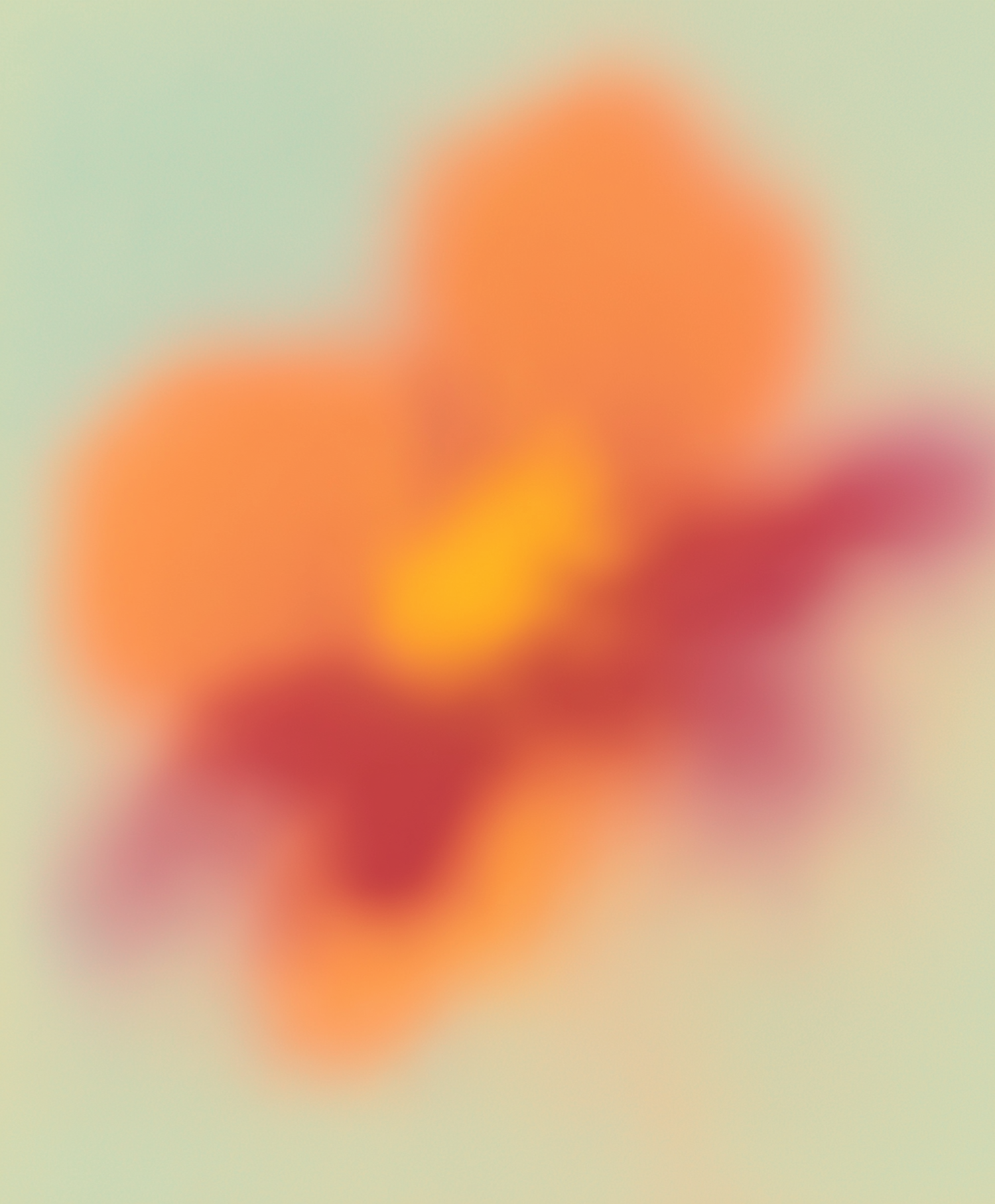Abstract blurred image with warm orange, yellow, and red tones, resembling a flower on a soft light background.