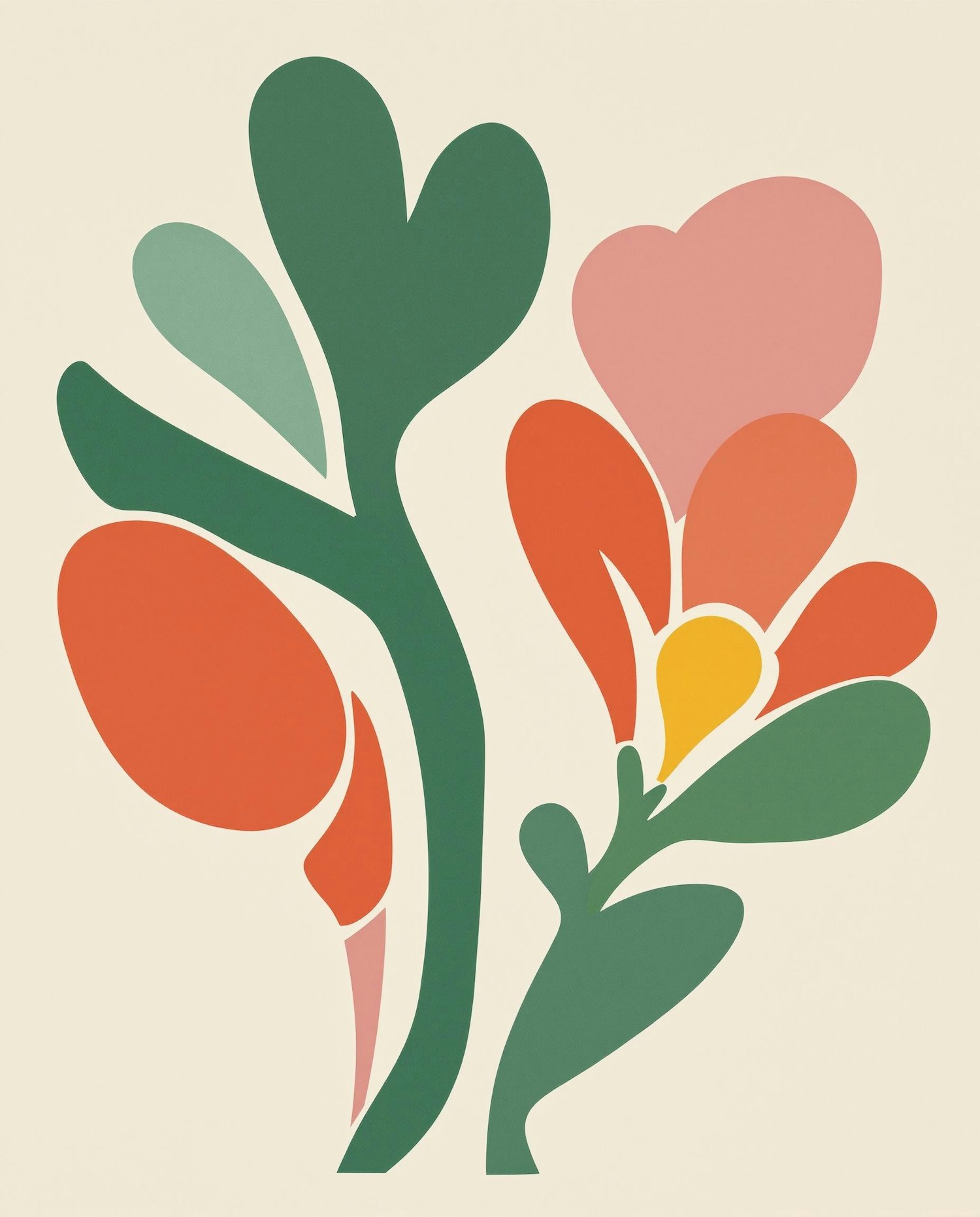 Abstract floral illustration with vibrant green leaves and orange, pink, and yellow flowers, set against a clean cream background.