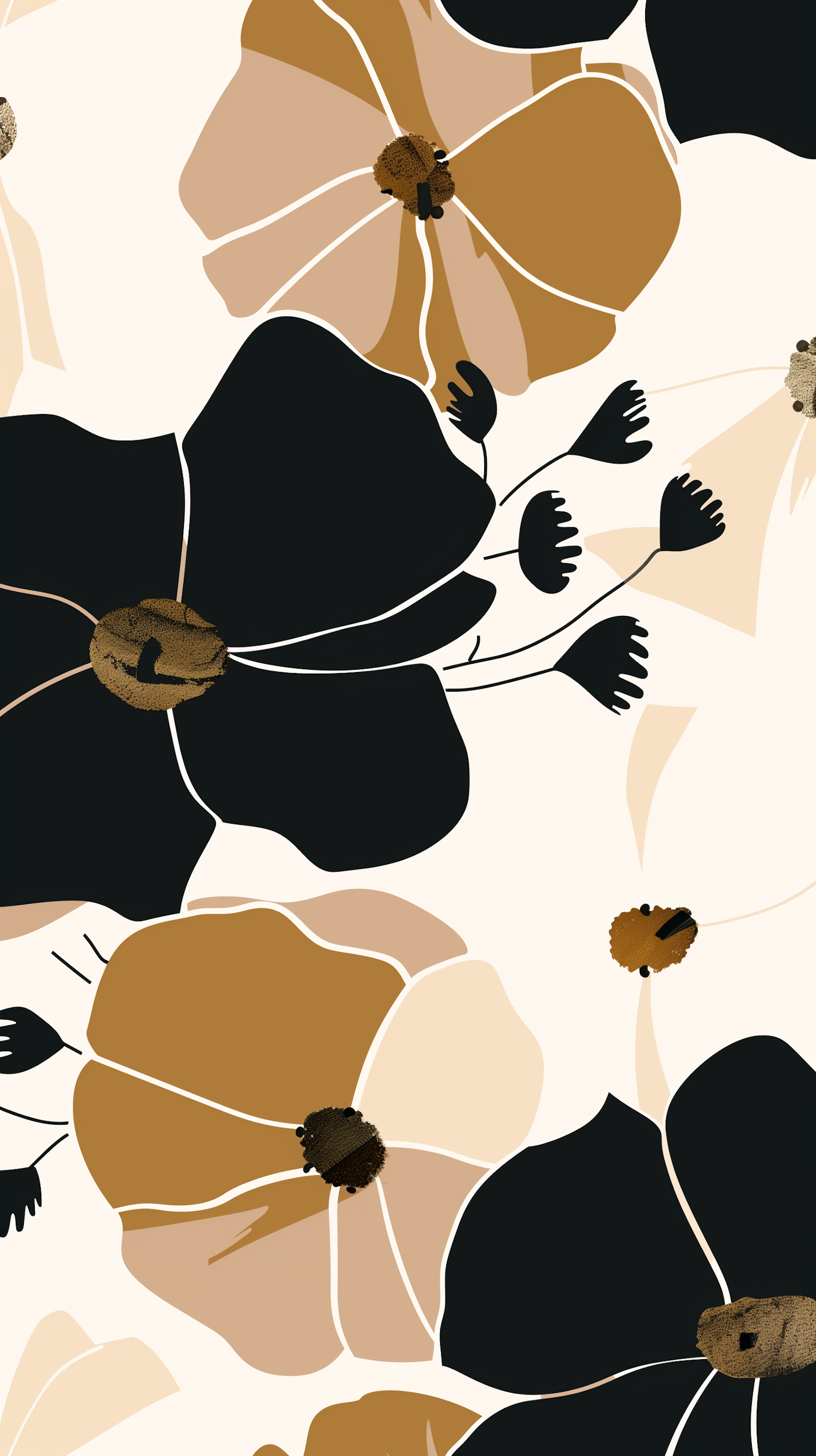 Modern abstract floral illustration with bold black, brown, and beige flowers on a cream background. Perfect for decor or design projects.